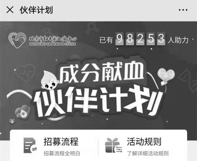 在無償獻(xiàn)血者的招募中,北京市紅十字血液中心也早早引入了“互聯(lián)網(wǎng)+”技術(shù),其中最為亮眼的莫過于首都成分獻(xiàn)血“伙伴計(jì)劃”項(xiàng)目。