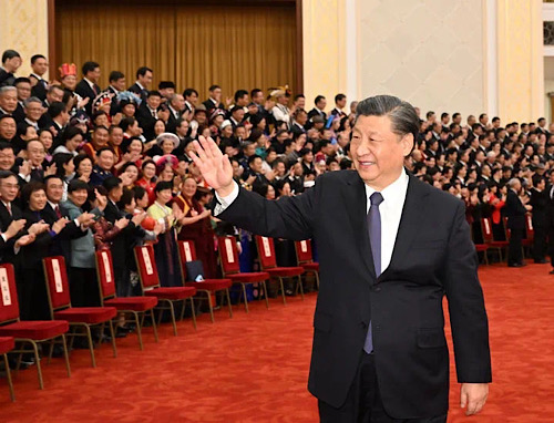3月11日,中國人民政治協(xié)商會議第十四屆全國委員會第一次會議在北京閉幕。閉幕會后,習(xí)近平等黨和國家領(lǐng)導(dǎo)人與出席會議的全體政協(xié)委員合影留念。這是習(xí)近平向委員揮手致意。新華社記者 李學(xué)仁 攝