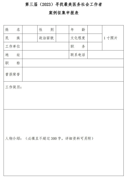 (點擊鏈接http://www.yataiyl.com/files/2023/04/747923088217443f9d988ae3ff3abea0.docx下載第三屆(2023)尋找最美醫(yī)務(wù)社會工作者案例征集申報表)
