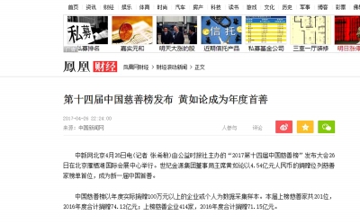 2017年4月26日,北京雁棲湖APEC國際會展中心。 在藍天白云的映照下,這座中式建筑群落顯得格外亮眼。與之交相輝印的,是一群中國慈善人。 會展中心場內人聲鼎沸,鎂光燈不停閃爍,每個人臉上都洋溢著溫暖的笑容。這里正在隆重舉行的是由《公益時報》社主辦的第十四屆(2017)中國慈善榜發(fā)布盛典。 慈善的力量 此次盛典匯聚了知名慈善家、慈善明星、慈善企業(yè)和各界愛心人士數(shù)百人,還有來自國內外的數(shù)十家媒體記者,他們聚集一堂,共同見證著過去一年來慈善在中華大地上結下的豐碩成果。慈善榜發(fā)布現(xiàn)場更像是一個愛的磁場,向整個社會傳遞著中國慈善的電波。 本屆慈善榜發(fā)布活動吸引了國內眾多媒體的熱情關注和報道。 新華網以“第十四屆中國慈善榜發(fā)布 鋼絲善行團獲特別貢獻獎”為題,對本次活動中低調神秘的“隱形慈善家”鋼子和他的“鋼絲善行團”進行了報道。其中較為詳細地介紹了“鋼絲善行團”的幾位骨干成員和他們的感人事跡。 中國青年網將關注的視角投向本屆慈善榜首度推出的“年度十大慈善項目”,并對獲得此次殊榮之一的“水滴籌”項目所帶來的社會正能量予以了充分肯定。文中說道:“水滴籌此次能夠獲得“年度十大慈善項目”稱號,是中國慈善榜的權威評委們對水滴籌在推動社會公益救助領域的發(fā)展上所做出貢獻的充分肯定,也是網絡個人大病救助平臺首次獲得國內公正權威機構的認可?!?nbsp; 搜狐網報道了榮膺中國十大慈善家之“最具情懷慈善家獎”的劉滄龍先生,并將組委會授予劉滄龍主席“中國十大慈善家之最具情懷慈善家”的頒獎詞進行轉載:“宏則龍騰滄海,達則兼善天下。他認為,一個好的企業(yè)要為顧客提供優(yōu)秀的產品和服務,而一個偉大的企業(yè)還要竭盡全力使這個世界變得更加美好……” 鳳凰網對獲得本屆慈善榜“慈善榜樣”的中海軟銀投資管理有限公司總裁潘世梁先生多年來對公益慈善事業(yè)的推動和貢獻,以及積極履行企業(yè)社會責任的突出表現(xiàn)進行了總結和梳理。 網易新聞從全方位多角度對本次盛典進行了盤點。對于廣大網友關注的中國慈善榜數(shù)據主要來源做了闡釋,歸結為:民政系統(tǒng)接受捐贈數(shù)據、捐贈者提供的數(shù)據、公益機構接受捐贈數(shù)據、上市公司年報公布數(shù)據、媒體公開報道的捐贈數(shù)據以及《公益時報》的公益檔案數(shù)據等六個方面。報道還援引了《公益時報》社長劉京在發(fā)布盛典致辭中表明的觀點:“新一批大額公益捐贈的持續(xù)涌現(xiàn),彰顯了中國企業(yè)家的時代特征,我們可以明確的向社會宣告,中國慈善家的群體正在形成?!?/p> 南方網、中華網、新浪網、中國新聞網、中國廣播網等多家媒體均從不同層面和角度對第十四屆中國慈善榜進行了報道。 公益時報社和北京時間首次專門為中國慈善榜開辟了網絡直播。這一新的嘗試頗引人關注。無論是盛典開幕前,公益時報社記者在現(xiàn)場發(fā)回的綜合報道,還是直播專訪參加本次盛典的慈善家和慈善明星,網友在線點擊量成績都不俗,網友互動交流相當踴躍。 榜樣的力量 各路媒體的報道,將人們帶回到當天的慈善榜發(fā)布盛典現(xiàn)場。來到這里的,有像世紀金源集團董事局主席黃如論這樣的知名企業(yè)家,他以4.54億元人民幣的捐贈位列慈善家榜單首位;也有像鋼子這樣一直默默致力于慈善事業(yè),至今不愿以真實姓名公諸于世的低調“隱形”慈善家。 這是中國最具影響力的慈善發(fā)布大會。本屆上榜慈善家共201位,2017年度合計捐贈74.12億元;上榜慈善企業(yè)414家,總捐贈額達到71.15億元,世紀金源集團董事局主席黃如論則以他的巨額捐贈成為新一屆中國首善。 這是中國最具明星號召力的慈善盛典。知名演員劉濤特意從片場請假來到中國慈善榜發(fā)布盛典的現(xiàn)場,她動情地講述了發(fā)生在自己身邊的愛心小故事,呼喚公眾“用愛和分享幫助更多的人?!毖輪T包貝爾、李光潔、叢珊紛紛表示,自己在慈善公益的道路上才剛剛起步,未來的日子他們會嘗試更多地投身慈善事業(yè)。 許多普通人也在為中國慈善事業(yè)貢獻著自己的力量。盛典開播前,一位不知名的舞蹈演員在現(xiàn)場排練,她向《公益時報》記者介紹即將在此次慈善榜盛典中表演的舞蹈《雪花》時說:“我們每一個人都像天空中飛舞的一片雪花,大家都能把慈善和愛心灑向廣闊的大地,這個世界才會更加美麗,更加有愛?!?/p> 還有很多的志愿者,他們忙碌在現(xiàn)場的每一個角落,只為讓更多的人了解慈善,走近慈善。 喬治·蘇德拉斯基為柯良藝術公益基金捐贈5000萬元人民幣,這不僅是一次資本與藝術的完美結合,更是一次慈善捐贈流向藝術領域的大手筆。 喬治·蘇德拉斯基是阿聯(lián)酋阿布扎比投資局的前任首席投資官,畫家柯良則創(chuàng)造了中西對比的現(xiàn)代繪畫,他的作品多次獲得世界大獎。蘇德拉斯基表示,中國的現(xiàn)代藝術必須被鼓勵和幫助,有很多年輕的藝術家需要走出去,被外面的世界認可,這個基金會對這些藝術家會有很好的幫助。 寧夏寶豐集團董事長黨彥寶多年來始終將慈善捐資的目光投向教育、助學扶貧領域。他帶領的燕寶慈善基金會累計捐資16.53億元,已資助寧夏籍11.7萬名學子完成了學業(yè)。讓黨彥寶