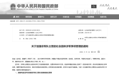 近日,民政部與中央軍委政治工作部聯(lián)合印發(fā)了《關于加強非軍隊主管的社會團體涉軍事項管理的通知》(以下簡稱《通知》),對加強非軍隊主管的社會團體涉軍工作管理作出統(tǒng)一安排。 《通知》指出,近年來,非軍隊主管的社會團體涉軍工作呈現(xiàn)增多趨勢,在推動軍地學術交流、促進軍民融合發(fā)展上發(fā)揮了一定的積極作用,但也存在擅自冠以涉軍名稱、隨意開展涉軍業(yè)務活動、吸收未按規(guī)定批準的軍隊人員和單位參加等問題,在軍內(nèi)外造成不良影響。 《通知》要求加強對冠以涉軍名稱的非軍隊主管社會團體的登記管理;規(guī)范非軍隊主管社會團體開展涉軍業(yè)務活動管理;嚴格軍隊人員和單位參加社會團體及其活動管理。 《通知》對軍隊社會團體涉軍事項管理工作做了有益補充,解決了非軍隊主管的社會團體涉軍事項日益增多所帶來的現(xiàn)實問題,對規(guī)范非軍隊主管的社會團體涉軍事項的管理、防止發(fā)生涉軍違規(guī)違紀問題、提高社會團體工作法治化水平,以及促進軍民融合發(fā)展戰(zhàn)略的深入實施具有重要意義。 一般不得冠以涉軍名稱 《通知》以列舉的方式,對成立非軍隊主管的社會團體及其分支機構一般不得冠以的涉軍名稱予以明確。 成立非軍隊主管的社會團體及其分支機構,一般不得冠以“解放軍”、“軍隊”、“全軍”、“武警”、“八一”、“軍事”、“將軍”、“將校”、“士兵”等涉軍名稱和部隊番號等字樣。 《通知》詳細規(guī)定了確因工作需要冠以涉軍名稱的社會團體及其分支機構應當履行的報批程序。確因工作需要冠以涉軍名稱的,其冠名事項應當征求軍隊有關部門意見。 全國性社會團體冠以涉軍名稱的,應當由業(yè)務主管單位商中央軍委機關有關業(yè)務部門后,由軍隊有關業(yè)務部門報中央軍委政治工作部同意;地方性社會團體冠以涉軍名稱的,應當由業(yè)務主管單位商軍隊大單位有關業(yè)務部門后,由軍隊有關業(yè)務部門報軍隊大單位政治工作部門同意。具體事宜由軍隊組織部門承辦。軍隊政治工作機關同意后,出具《同意冠以涉軍名稱的證明》,民政部門依據(jù)《同意冠以涉軍名稱的證明》辦理相關手續(xù)。分支機構冠以涉軍名稱的,參照上述程序執(zhí)行。 已經(jīng)冠以涉軍名稱的非軍隊主管的社會團體及分支機構,應當按照以上程序權限重新履行報批手續(xù),未履行相關手續(xù)前不得再組織相關活動。 開展涉軍業(yè)務活動需報批 非軍隊主管的社會團體及其分支機構開展涉軍業(yè)務活動,主要包含兩種情況:一是社會團體章程規(guī)定的業(yè)務范圍與軍隊有關部門擔負的職能交叉重疊;二是社會團體章程規(guī)定的業(yè)務范圍與軍隊部門擔負的職能業(yè)務沒有直接關聯(lián),但因特殊情況需要開展與軍隊有關的業(yè)務活動。 針對第一種情況,《通知》規(guī)定,全國性社會團體由業(yè)務主管單位根據(jù)章程中涉軍業(yè)務范圍,商軍隊相應單位和部門后,由軍隊相應單位和部門逐級報中央軍委機關有關業(yè)務部門同意,同時報中央軍委政治工作部組織局備案;地方性社會團體由業(yè)務主管單位根據(jù)章程中涉軍業(yè)務范圍,商軍隊相應單位和部門后,由軍隊相應單位和部門逐級報軍隊大單位有關業(yè)務部門同意,同時報軍隊大單位組織部門備案。備案后,社會團體可在其章程規(guī)定的業(yè)務范圍內(nèi)開展涉軍業(yè)務活動,可以不再履行“一事一報”的報批手續(xù),每年12月31日前將開展涉軍業(yè)務活動情況報軍隊相應業(yè)務部門。 針對第二種情況,明確一般不得開展涉軍業(yè)務活動,確需開展的,應按照“一事一報”原則,由社會團體直接按程序向軍隊相應單位和部門申請:全國性社會團體,應當商軍隊相應單位和部門后,由軍隊相應單位和部門逐級報中央軍委機關有關業(yè)務部門同意,同時報中央軍委政治工作部組織局備案;地方性社會團體,應當商軍隊相應單位和部門后,由軍隊相應單位和部門逐級報軍隊大單位有關業(yè)務部門同意,同時報軍隊大單位組織部門備案。 嚴格軍隊退役人員管理 《通知》強調(diào),軍隊人員(指軍隊編制的現(xiàn)役軍人、文職人員、職工和軍隊管理的離退休人員)和單位參加社會團體及其活動,必須嚴格執(zhí)行《軍隊社會團體管理工作規(guī)定》明確的有關要求。已移交地方的軍隊退休人員參加社會團體及其活動,軍隊不再負責審批。移交政府安置的軍隊退休干部參加社會團體及其活動的管理和審批,按照安置地國家機關同職級退休干部相關規(guī)定執(zhí)行;無軍籍退休職員干部按照安置地事業(yè)單位同職級退休干部相關規(guī)定執(zhí)行。軍隊退役人員不得以軍人身份參加社會團體和社團活動。 軍隊人員和單位參加的社會團體,應當限于中央和國家機關、人民團體、省級黨委和人民政府以及軍隊單位作為業(yè)務主管單位的社會團體,或者是在省級以上人民政府民政部門登記的行業(yè)協(xié)會類、科技類、公益慈善類社會團體。 軍隊人員參加社會團體、兼任社會團體負責人,必須以《軍隊人員參加社會團體批準書》為憑;軍隊單位參加社會團體,必須以《軍隊單位參加社會團體批準書》為憑。軍隊人員和單位無《軍隊人員參加社會團體批準書》和