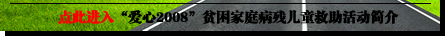 “愛心·希望”是“愛心2008”貧困家庭病殘兒童救助活動的深化和延續(xù),其宗旨是秉承和繼續(xù)發(fā)揚“愛心2008”的救助理念和精神,更多更好地幫助貧困家庭的病殘兒童!皭坌2008”貧困家庭病殘兒童救助活動自2005年6月1日啟動以來,重點在陜西、四川、江西、重慶、青海、內(nèi)蒙古、寧夏等省市自治區(qū)開展貧困家庭病殘兒童救助活動,截止目前累計救助4100多名病殘兒童。2005年6月1日至2008年5月31日間共救助3683名患兒,超額完成了“第一階段三年救助2008名患兒”的宏偉目標(biāo)。“愛心2008”活動第一階段之所以取得圓滿成功得益于原國務(wù)院副總理姜春云、十一屆全國人大副委員長周鐵農(nóng)、十屆全國人大副委員長顧秀蓮、十屆全國人大副委員長司馬懿艾買提、十屆全國人大副委員長何魯麗、十一屆全國政協(xié)副主席阿不來提·阿布都熱西提、十一屆全國政協(xié)副主席張梅穎、十屆全國政協(xié)副主席郝建秀、九屆全國政協(xié)副主席孫孚凌、民政部部長李學(xué)舉、民政部副部長李立國、民政部副部長姜力、民政部副部長竇玉沛等國家和民政部領(lǐng)導(dǎo)關(guān)懷和支持;得益于民政部、中央綜治辦、全國總工會、共青團中央、全國婦聯(lián)、中國紅十字總會、中華慈善總會、中國老齡協(xié)會等部門的大力支持;得益于中國福彩中心、中信銀行、中國石化、香港馬會等眾多愛心企業(yè)的慷慨解囊;得益于社會知名人士、文體界明星、愛心人士的無私奉獻;得益于地方民政工作者、醫(yī)療機構(gòu)、志愿者的辛勤工作。
