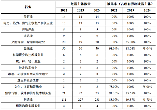 從所有制類(lèi)別來(lái)看,2022至2024年度,國(guó)有控股上市公司強(qiáng)制披露主體的披露率均高于民營(yíng)企業(yè)、公眾企業(yè)等。2024年度,非國(guó)有企業(yè)強(qiáng)制披露主體的披露率已達(dá)90.48%(209家),國(guó)有企業(yè)的強(qiáng)制披露主體的披露率為99.45%(180家)。