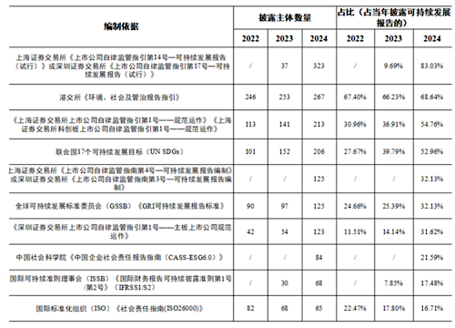 在編制依據(jù)方面,2024年度,389家已披露可持續(xù)發(fā)展相關(guān)報(bào)告的強(qiáng)制披露主體中,披露遵照《上市公司可持續(xù)發(fā)展報(bào)告指引》編寫(xiě)報(bào)告的公司占比達(dá)83.03%(323家)。除前述指引外,香港交易所《環(huán)境、社會(huì)及管治報(bào)告守則》、滬深證券交易所上市公司規(guī)范運(yùn)作指引、聯(lián)合國(guó)可持續(xù)發(fā)展目標(biāo)(UN SDGs)是其他主要的可持續(xù)發(fā)展報(bào)告編制依據(jù)。
