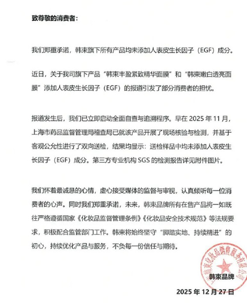 12月27日,@韓束KANS發(fā)文稱,“報道發(fā)生后,我們已立即啟動全面自查與追溯程序。早在2025年11月,上海市藥品監(jiān)督管理局稽查局已就該產(chǎn)品開展了現(xiàn)場核驗與檢測,并基于客觀公允性進行了雙向送檢,結果均顯示送檢樣品中均未添加人表皮生長因子(EGF)成分。”