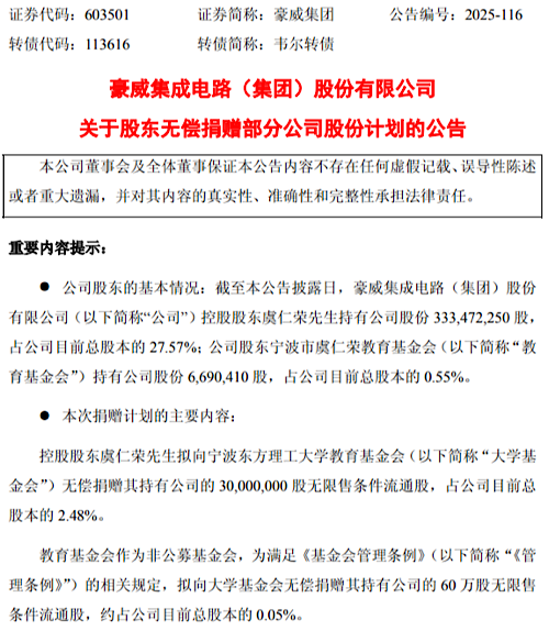 公開資料顯示,2007年,虞仁榮與合伙人在上海共同創(chuàng)立韋爾股份;2019年,韋爾股份完成了對美國豪威科技的收購,并于2025年5月審議通過更名議案,同年6月20日正式將證券簡稱變更為“豪威集團”。按當日豪威集團收盤價121.08元/股計算,此次捐贈股份市值合計超37億元,其中虞仁榮個人捐贈部分市值約36億元。
