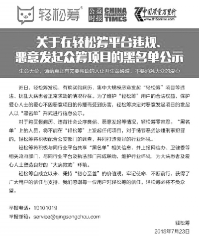 7月23日,輕松籌發(fā)布了行業(yè)首份黑名單,對于購買假病歷、違背社會公序良俗、惡意發(fā)起項目的發(fā)起人,將不能在輕松籌上發(fā)起任何項目。