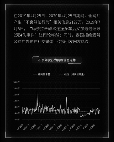 國家統(tǒng)計局數(shù)據(jù)顯示,2012至2018年間,全國共發(fā)生交通事故144.8萬起,有42.5萬人因交通事故而喪生。2019年4月25日至2020年4月25日,全網(wǎng)共產(chǎn)生“道路交通安全”相關信息4166萬條,其中“不良駕駛行為”相關信息達2127萬條,占比超50%。