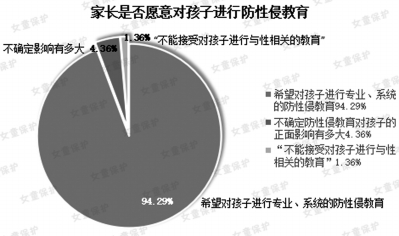 “女童保護(hù)”調(diào)查顯示,94.29%的家長(zhǎng)希望對(duì)孩子進(jìn)行專業(yè)、系統(tǒng)的防性侵教育,4.36%的家長(zhǎng)不確定防性侵教育對(duì)孩子的正面影響有多大,僅有1.36%的家長(zhǎng)“不能接受對(duì)孩子進(jìn)行與性相關(guān)的教育”。