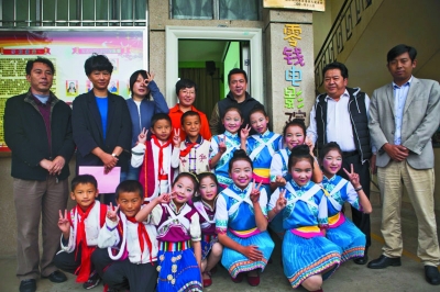 2016年10月26日,在云南麗江的玉龍納西族自治縣拉市鎮(zhèn)海南完小,孩子們穿著納西族服裝在小雨中跳起了歡快的納西族舞蹈,歡迎“零錢電影院”的開放。