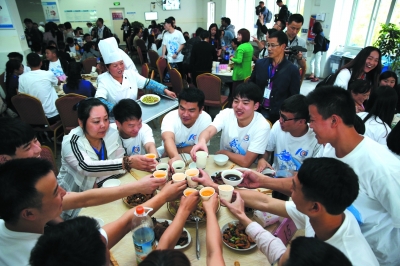 因?yàn)橄掠?,原本安排在家園院子里的“團(tuán)圓飯”改在了食堂里,熱烈而溫馨的氣氛讓人們忘記了屋外冷雨的寒意。