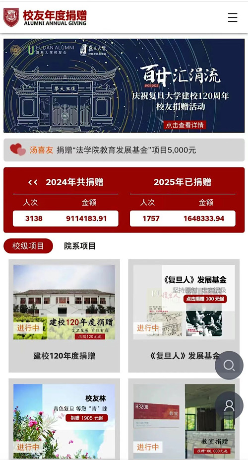 由復(fù)旦大學(xué)校友會運營的“校友年度捐贈網(wǎng)”