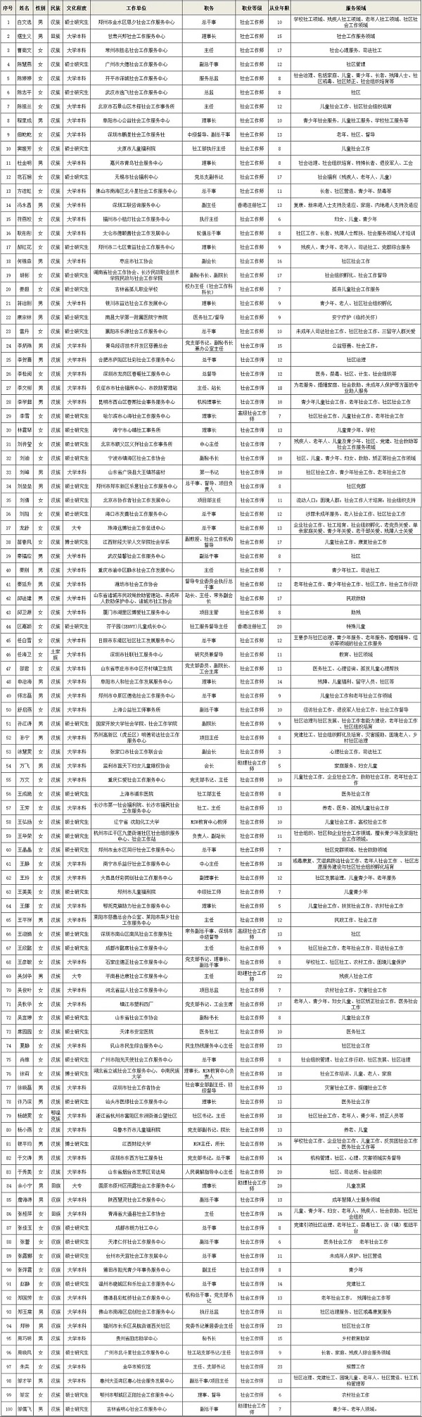 3月18日,第十一屆(2021)中國社工年會在北京舉行。年會上,“2020年度中國十大社工人物”及“2020年度中國百名社工人物”正式對外發(fā)布。具體名單如下: