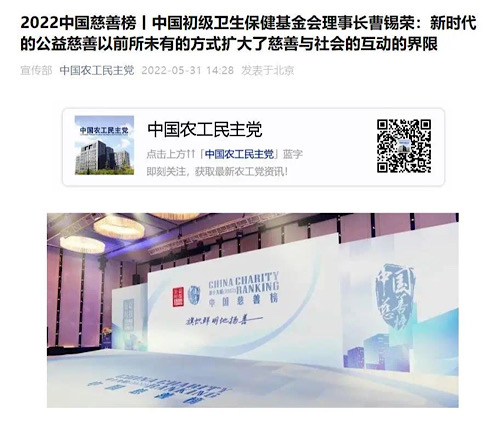 “中國(guó)農(nóng)工民主黨”微信公眾號(hào)發(fā)文稱(chēng),作為行業(yè)中堅(jiān)力量,基金會(huì)在推動(dòng)慈善事業(yè)發(fā)展、服務(wù)國(guó)家大政方針等方面發(fā)揮著重要作用,中國(guó)初級(jí)衛(wèi)生保健基金會(huì)等基金會(huì)充分發(fā)揮了“年度榜樣基金會(huì)(公募)”的帶動(dòng)作用,并分享了中國(guó)初級(jí)保健基金會(huì)理事長(zhǎng)曹錫榮在中國(guó)慈善榜發(fā)布活動(dòng)中的主旨演講。