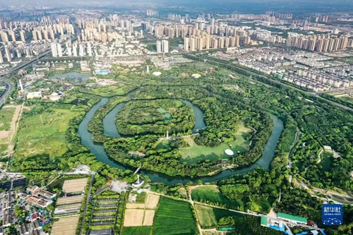 這是在江蘇省常州市拍攝的春秋淹城遺址與武進(jìn)城區(qū)景色(2022年8月6日攝,無人機(jī)照片)。新華社記者 楊磊 攝