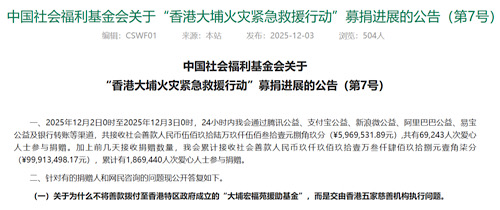 3日,中國社會福利基金會官網(wǎng)發(fā)布了關(guān)于“香港大埔火災(zāi)緊急救援行動”募捐進(jìn)展的公告(第7號)。根據(jù)公告,12月2日0時(shí)至3日0時(shí),24小時(shí)內(nèi)基金會通過騰訊公益、支付寶公益、新浪微公益、阿里巴巴公益、易寶公益及銀行轉(zhuǎn)賬等渠道,共接收社會善款5969531.89元,共有69243人次愛心人士參與捐贈。加上前幾天接收的捐贈,累計(jì)接收社會善款99913498.17元,累計(jì)有1869440人次愛心人士參與捐贈。