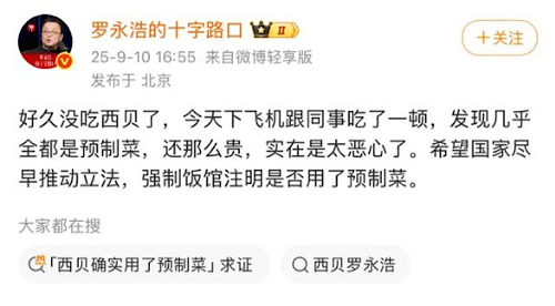 9月10日,羅永浩在微博公開吐槽連鎖餐飲品牌西貝:“幾乎全是預制菜,還那么貴”。次日,西貝創(chuàng)始人賈國龍用三個“一定”回應:“我們一定會起訴他,一定一定會起訴他!”相關話題隨即沖上熱搜。