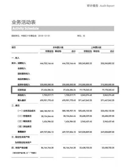 中國紅十字基金會《審計報告》顯示,2018年基金會取得投資收益27,436,586.26元■ 本報記者 張明敏