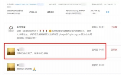 截至記者發(fā)稿時,中國扶貧基金會表示,17000元“誤捐”款項已于6月2日原路退回劉先生賬戶,并得到劉先生確認。