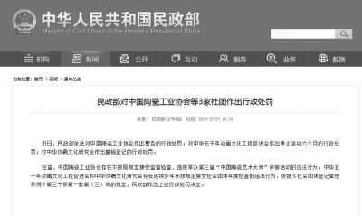 去年7月,中國(guó)陶瓷工業(yè)協(xié)會(huì)主辦的第三屆“中國(guó)陶瓷藝術(shù)大師”評(píng)審活動(dòng),評(píng)選出91名“中國(guó)陶瓷藝術(shù)大師”。5個(gè)月后,民政部將此次評(píng)審活動(dòng)定性為“違法行為”,并作出警告的行政處罰。