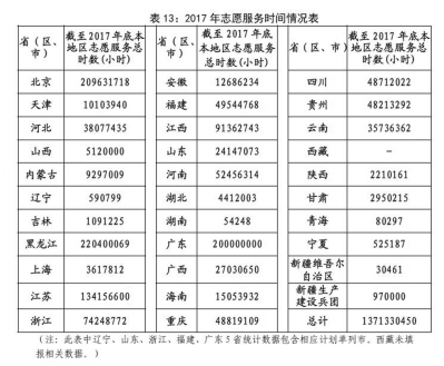 截至2017年底,全國共有1657個縣(市、區(qū))、14062個街(鎮(zhèn))、69651個社區(qū)和102931個單位開展了志愿服務(wù)記錄工作。各地累計志愿服務(wù)時間已超過13.7億小時。