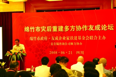 2008年5月12日,友成基金會成立一周年。雖2007成立基金會之初的戰(zhàn)略規(guī)劃中不包括救災(zāi),出于本能的人道主義關(guān)懷,友成參與救災(zāi)。地震次日抵達災(zāi)區(qū)后現(xiàn)場發(fā)現(xiàn)有很多應(yīng)急需求出現(xiàn)。此時,民間組織與政府之間應(yīng)該呈現(xiàn)出一種怎樣的合作成為基金會思考的問題。為此,基金會推出了志愿者協(xié)調(diào)辦公室和社會資源協(xié)調(diào)平臺,引入專家資源、企業(yè)和研究者,讓其達成一種合作模式。最終,四川綿竹搭建起了政社合作模式,在2013年蘆山地震救災(zāi)時也產(chǎn)生了積極的示范作用。