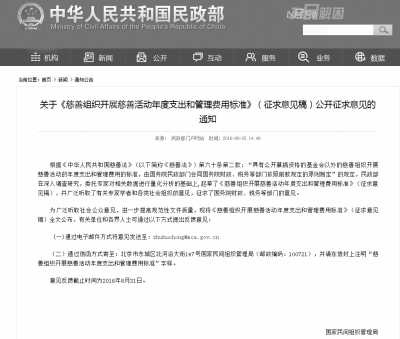 8月25日,民政部民間組織管理局公布了《慈善組織開(kāi)展慈善活動(dòng)年度支出和管理費(fèi)用標(biāo)準(zhǔn)》(征求意見(jiàn)稿),并公開(kāi)征求意見(jiàn)。意見(jiàn)反饋截止時(shí)間為2016年8月31日。