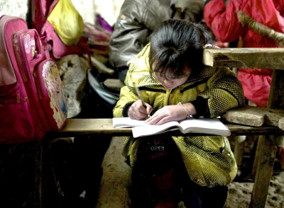 泥樹小學是兩方土屋,由于房屋破舊,學校不敢牽入電線,教室里沒有電燈,只能靠四扇漏風的窗戶取光,而貴州山區(qū)冬天多霧少太陽,孩子們上課學習很困難,一名孩子為了能看清書本不得不蹲在地上“借光”。 |