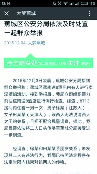 徐某在接受《公益時(shí)報(bào)》記者采訪時(shí)表示:“被傳喚時(shí),我跟田某都還穿著棉衣褲,更未有任何違法行為?!?/p>