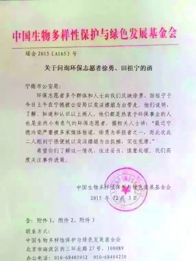 中國生物多樣性保護(hù)與綠色發(fā)展基金會(huì)于2015年12月3日向福建寧德警方發(fā)出問詢函,函件中稱,“最近寧德污染嚴(yán)重被多家媒體報(bào)道,徐某為舉報(bào)者之一,而此次剛到寧德便被以賣淫嫖娼罪被捕,實(shí)在荒唐?!?/p>