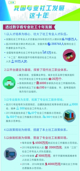 2016年是黨的十六屆六中全會(huì)做出建設(shè)宏大社會(huì)工作人才隊(duì)伍決策部署的第十年。為全面總結(jié)十年來社會(huì)工作發(fā)展成績(jī)與經(jīng)驗(yàn),研究明確“十三五”時(shí)期社會(huì)工作推進(jìn)思路與目標(biāo)任務(wù),11月7日,民政部在廣州召開全國(guó)社會(huì)工作推進(jìn)會(huì),民政部副部長(zhǎng)顧朝曦出席會(huì)議并講話,廣東省人民政府副省長(zhǎng)何忠友出席會(huì)議并致辭。 顧朝曦全面總結(jié)了十年社會(huì)工作發(fā)展成就。他指出,十年來,我國(guó)初步建立了綜合政策引領(lǐng)、專項(xiàng)政策配套、地方政策支撐的社會(huì)工作制度框架;社會(huì)工作專業(yè)人才隊(duì)伍迅速壯大,規(guī)??偭窟_(dá)到76萬人,其中持證社工近30萬人;相關(guān)事業(yè)單位、群團(tuán)組織、社區(qū)和社會(huì)組織社會(huì)工作專業(yè)崗位超過20萬個(gè),社會(huì)工作服務(wù)機(jī)構(gòu)達(dá)到6600余家。社會(huì)工作從民政領(lǐng)域逐步拓展到多個(gè)領(lǐng)域,從東部發(fā)達(dá)地區(qū)延伸到中西部邊遠(yuǎn)貧困地區(qū),在助力保障改善民生、創(chuàng)新社會(huì)治理、促進(jìn)社會(huì)和諧、夯實(shí)黨的執(zhí)政基礎(chǔ)中發(fā)揮了重要作用。 顧朝曦強(qiáng)調(diào),“十三五”時(shí)期,要按照“四個(gè)全面”戰(zhàn)略布局的總體部署和中央有關(guān)決策要求,進(jìn)一步加強(qiáng)社會(huì)工作專業(yè)人才隊(duì)伍建設(shè),加快推動(dòng)社會(huì)工作全面深入發(fā)展。 一是進(jìn)一步健全制度體系。要加快推動(dòng)社會(huì)工作立法,研究制定社會(huì)工作專業(yè)人才管理?xiàng)l例。要盡快制定高級(jí)社會(huì)工作師評(píng)價(jià)辦法,健全社會(huì)工作專業(yè)人才職業(yè)評(píng)價(jià)體系。要抓好中央12部門剛剛發(fā)布的《關(guān)于加強(qiáng)社會(huì)工作專業(yè)崗位開發(fā)與人才激勵(lì)保障的意見》貫徹落實(shí)。要建立健全政府購買社會(huì)工作服務(wù)制度,建立健全社區(qū)、社會(huì)組織和社會(huì)工作“三社聯(lián)動(dòng)”機(jī)制,建立健全社會(huì)工作者和志愿工作者“兩工協(xié)作”機(jī)制。 二是進(jìn)一步壯大人才隊(duì)伍。要進(jìn)一步夯實(shí)社會(huì)工作培訓(xùn)基礎(chǔ),聚合民政系統(tǒng)內(nèi)外的培訓(xùn)資源,對(duì)社會(huì)工作從業(yè)人員有計(jì)劃、大規(guī)模、系統(tǒng)化地開展專業(yè)培訓(xùn)。要發(fā)揮社會(huì)工作職業(yè)水平評(píng)價(jià)在人才培養(yǎng)選拔中的杠桿作用,積極引導(dǎo)和鼓勵(lì)符合條件人員參加職業(yè)水平考試。要大力支持發(fā)展社會(huì)工作專業(yè)教育,健全專科、本科和研究生相銜接的社會(huì)工作教育體系。要加快培養(yǎng)一批具有重要引領(lǐng)示范帶動(dòng)作用的高層次社會(huì)工作專業(yè)人才隊(duì)伍。 三是進(jìn)一步拓展服務(wù)平臺(tái)。力爭(zhēng)到2020年,實(shí)現(xiàn)社會(huì)工作專業(yè)崗位與人才的合理配置,每個(gè)城市社區(qū)和農(nóng)村鄉(xiāng)鎮(zhèn)至少配備1名社會(huì)工作專業(yè)人才,基層社會(huì)服務(wù)部門、社會(huì)服務(wù)類事業(yè)單位、社區(qū)服務(wù)類與公益慈善類社會(huì)組織配備一定數(shù)量的社會(huì)工作專業(yè)人才;全國(guó)范圍內(nèi)社會(huì)工作服務(wù)機(jī)構(gòu)數(shù)量達(dá)到1萬家;基本形成覆蓋省、市、縣三級(jí)的社會(huì)工作行業(yè)體系。 四是進(jìn)一步發(fā)展專業(yè)服務(wù)。要率先在民政業(yè)務(wù)領(lǐng)域深化拓展社會(huì)工作服務(wù)。要支持配合有關(guān)部門完善社區(qū)矯正、青少年事務(wù)社會(huì)工作服務(wù)制度,抓緊協(xié)調(diào)出臺(tái)加強(qiáng)扶貧、禁毒和工會(huì)領(lǐng)域社會(huì)工作專業(yè)人才隊(duì)伍建設(shè)意見,加快推動(dòng)殘障康復(fù)、醫(yī)療衛(wèi)生、教育輔導(dǎo)、婦女和婚姻家庭服務(wù)等領(lǐng)域社會(huì)工作政策的研究制定。要加大對(duì)中西部貧困地區(qū)社會(huì)工作發(fā)展的支持力度。 (據(jù)民政部網(wǎng)站) |