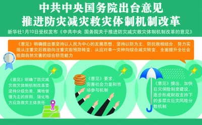 《中共中央 國務院關于推進防災減災救災體制機制改革的意見》1月10日公布。民政部相關負責人表示,《意見》著眼當前我國防災減災救災工作面臨的問題和體制機制方面的制約因素,通過頂層設計,針對三大體制機制完善升級提出了一系列改革舉措,有助于不斷提升我國防災減災救災能力。 我國是世界上自然災害最為嚴重的國家之一,災害種類多,分布地域廣,發(fā)生頻率高,造成損失重。近年來,基于對自然災害形勢的研判,我國不斷探索,確立了以防為主、防抗救相結合的工作方針,積累了寶貴經驗,綜合防災減災救災能力明顯提升。 然而,我國面臨的自然災害形勢依然復雜嚴峻,實際工作中也發(fā)現,防災減災救災工作出現了管理體制不順、相關法律法規(guī)分散零碎、部門之間工作脫節(jié)、一些地方重救災輕減災等問題。 民政部相關負責人表示,對于加強防災減災救災工作,習近平總書記在中央政治局集體學習和到河北唐山考察時分別作出過重要指示,要求進一步增強憂患意識、責任意識,全面提升全社會抵御自然災害的綜合防范能力。中央深改組第28次會議審議通過相關文件,明確了推進防災減災救災體制機制改革的方向。 此次出臺的《意見》,對推進防災減災救災體制機制改革明確了五項基本原則:堅持以人為本,切實保障人民群眾生命財產安全;堅持以防為主、防抗救相結合;堅持綜合減災,統(tǒng)籌抵御各種自然災害;堅持分級負責、屬地管理為主;堅持黨委領導、政府主導、社會力量和市場機制廣泛參與。 根據《意見》,我國將著力從三方面推進防災減災救災體制機制改革: ——健全統(tǒng)籌協(xié)調體制。總體要求是統(tǒng)籌災害管理和綜合減災。其中,尤其是要加強各種自然災害管理全過程的綜合協(xié)調,強化資源統(tǒng)籌和工作協(xié)調。充分發(fā)揮國家減災委員會等有關部門和軍隊、武警部隊的職能作用。同時,要牢固樹立災害風險管理理念,轉變重救災輕減災思想,將防災減災納入國民教育計劃。 ——健全屬地管理體制?!兑庖姟窂娬{,要強化地方應急救災主體責任、健全災后恢復重建工作制度、完善軍地協(xié)調聯(lián)動制度。對達到國家啟動響應等級的自然災害,中央發(fā)揮統(tǒng)籌指導和支持作用,地方黨委和政府在災害應對中發(fā)揮主體作用,承擔主體責任。同時,要健全軍隊和武警部隊參與搶險救災的應急協(xié)調機制,提升軍地應急救援協(xié)助水平。 ——完善社會力量和市場參與機制。一方面,要研究制定和完善社會力量參與防災減災救災的相關制度,完善政府與社會力量協(xié)同救災聯(lián)動機制,落實支持措施。另一方面,要鼓勵支持社會力量全方位參與,構建多方參與的社會化防災減災救災格局,如加快巨災保險制度建設、積極推進農業(yè)保險和農村住房保險工作等。 民政部相關負責人表示,要推動各項改革措施落到實處,需要通過加大宣傳調動各方面積極性,通過及時修訂完善相關法律法規(guī)和預案強化法治保障,通過健全資金多元投入機制加大資金支持力度。 與此同時,落實還需要有明確的計劃以及相應的督促舉措。 該負責人表示,《意見》明確了分工方案,規(guī)定了牽頭部門和完成時間,需要負責部門及時制定方案推進落實。各地區(qū)要發(fā)揮主動性和創(chuàng)造性,積極探索,破解難題,積累經驗。要建立督促檢查機制,根據明確的責任和要求,督促工作落實。對做得好的地區(qū)或單位要表揚鼓勵,對工作落后的地區(qū)或單位要幫助查找原因,推動整改工作。 (據新華社) |