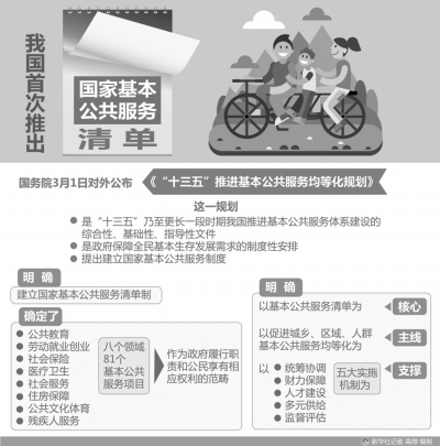 3月1日,國務(wù)院印發(fā)的《“十三五”推進(jìn)基本公共服務(wù)均等化規(guī)劃》正式對外公布?!兑?guī)劃》提出,到2020年,基本公共服務(wù)體系更加完善,體制機(jī)制更加健全,在學(xué)有所教、勞有所得、病有所醫(yī)、老有所養(yǎng)、住有所居等方面持續(xù)取得新進(jìn)展,基本公共服務(wù)均等化總體實現(xiàn)。 什么是基本公共服務(wù)? 據(jù)國家發(fā)展改革委有關(guān)負(fù)責(zé)人介紹,基本公共服務(wù)是由政府主導(dǎo)、保障全體公民生存和發(fā)展基本需要、與經(jīng)濟(jì)社會發(fā)展水平相適應(yīng)的公共服務(wù),是公共服務(wù)中最基礎(chǔ)、最核心的部分,是最基本的民生需求,也是政府公共服務(wù)職能的“底線”。 基本公共服務(wù)范圍,一般包括保障基本民生需求的教育、就業(yè)、社會保障、醫(yī)療衛(wèi)生、住房保障、文化體育等領(lǐng)域的公共服務(wù),廣義上還包括與人民生活環(huán)境緊密關(guān)聯(lián)的交通、通信、公用設(shè)施、環(huán)境保護(hù)等領(lǐng)域的公共服務(wù),以及保障安全需要的公共安全、消費安全和國防安全等領(lǐng)域的公共服務(wù)。 考慮到政策延續(xù)和財政保障能力,規(guī)劃確定的基本公共服務(wù)范圍與“十二五”保持一致,即為公共教育、就業(yè)創(chuàng)業(yè)、社會保險、醫(yī)療衛(wèi)生、社會服務(wù)、住房保障、文化體育、殘疾人服務(wù)等八個領(lǐng)域。 “均等化”的內(nèi)涵是什么? 國家發(fā)展改革委有關(guān)負(fù)責(zé)人表示,基本公共服務(wù)均等化是指全體公民都能公平可及地獲得大致均等的基本公共服務(wù),其核心是促進(jìn)機(jī)會均等,重點是保障人民群眾得到基本公共服務(wù)的機(jī)會,而不是簡單的平均化。 推進(jìn)均等化是一項長期艱巨的任務(wù)?!笆濉睍r期,按照中央脫貧攻堅目標(biāo),必須重點確保貧困地區(qū)基本公共服務(wù)主要領(lǐng)域指標(biāo)接近全國平均水平,從而達(dá)的目標(biāo)。 “十三五”推進(jìn)基本公共服務(wù)均等化的主要目標(biāo)是,到2020年,基本公共服務(wù)體系更加完善,體制機(jī)制更加健全,在學(xué)有所教、勞有所得、病有所醫(yī)、老有所養(yǎng)、住有所居等方面持續(xù)取得新進(jìn)展,基本公共服務(wù)均等化總體實現(xiàn)。具體包括四個方面: 一是均等化水平穩(wěn)步提高。城鄉(xiāng)區(qū)域間基本公共服務(wù)大體均衡,貧困地區(qū)基本公共服務(wù)主要領(lǐng)域指標(biāo)接近全國平均水平,廣大群眾享有基本公共服務(wù)的可及性顯著提高。 二是標(biāo)準(zhǔn)體系全面建立。國家基本公共服務(wù)清單基本建立,標(biāo)準(zhǔn)體系更加明確并實現(xiàn)動態(tài)調(diào)整。 三是保障機(jī)制鞏固健全?;竟卜?wù)供給保障措施更加完善,可持續(xù)發(fā)展的長效機(jī)制基本形成。 四是制度規(guī)范基本成型。各領(lǐng)域制度規(guī)范銜接配套、基本完備,服務(wù)提供和享有有規(guī)可循、有責(zé)可督,基本公共服務(wù)依法治理水平明顯提升。 基本社會服務(wù)有哪些? 社會服務(wù)是社會組織參與的重要領(lǐng)域,那么基本社會服務(wù)的內(nèi)容有哪些呢? 《規(guī)劃》顯示,本領(lǐng)域服務(wù)項目共13項,具體包括:最低生活保障、特困人員救助供養(yǎng)、醫(yī)療救助、臨時救助、受災(zāi)人員救助、法律援助、老年人福利補(bǔ)貼、困境兒童保障、農(nóng)村留守兒童關(guān)愛保護(hù)、基本殯葬服務(wù)、優(yōu)待撫恤、退役軍人安置、重點優(yōu)撫對象集中供養(yǎng)。 共有四項重點任務(wù):第一,社會救助。推進(jìn)城鄉(xiāng)低保統(tǒng)籌發(fā)展,健全低保對象認(rèn)定辦法,建立低保標(biāo)準(zhǔn)動態(tài)調(diào)整機(jī)制,確保農(nóng)村低保標(biāo)準(zhǔn)逐步達(dá)到國家扶貧標(biāo)準(zhǔn)。完善特困人員認(rèn)定條件,合理確定救助供養(yǎng)標(biāo)準(zhǔn),適度提高救助供養(yǎng)水平。合理界定醫(yī)療救助對象,健全疾病應(yīng)急救助制度,全面開展重特大疾病醫(yī)療救助工作,加強(qiáng)醫(yī)療救助與基本醫(yī)療保險、大病保險和其他救助制度的銜接。全面、高效實施臨時救助制度。降低法律援助門檻,擴(kuò)大法律援助范圍。 第二,社會福利。全面建立針對經(jīng)濟(jì)困難高齡、失能老年人的補(bǔ)貼制度,并做好與長期護(hù)理保險的銜接。提高城鄉(xiāng)社區(qū)衛(wèi)生服務(wù)機(jī)構(gòu)為老年人提供醫(yī)療保健服務(wù)的能力,加快社區(qū)居家養(yǎng)老信息網(wǎng)絡(luò)和服務(wù)能力建設(shè),推進(jìn)醫(yī)養(yǎng)結(jié)合發(fā)展。進(jìn)一步完善孤兒基本生活保障制度,做好困境兒童保障工作,統(tǒng)籌推進(jìn)未成年人社會保護(hù)試點和農(nóng)村留守兒童關(guān)愛保護(hù)。全面推進(jìn)精神障礙患者社區(qū)康復(fù)服務(wù)。 第三,社會事務(wù)。建立和完善公民婚姻信息數(shù)據(jù)庫,探索開展異地辦理婚姻登記工作。完善兒童被收養(yǎng)前尋親公告程序,全面建立收養(yǎng)能力評估制度。推進(jìn)基本殯葬公共服務(wù),鞏固提高遺體火化率,推行火葬區(qū)骨灰和土葬改革區(qū)遺體規(guī)范、集中節(jié)地生態(tài)安葬。做好第二次全國地名普查,健全地名管理法