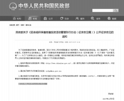12月7日,民政部公布了《慈善組織保值增值投資活動管理暫行辦法(征求意見稿)》(以下簡稱《辦法》),并向社會公開征求意見。意見反饋截止時間為2018年1月6日。 《辦法》共二十五條,對慈善組織為實現(xiàn)財產(chǎn)保值增值開展投資活動的基本原則,投資范圍、模式及條件,投資決策運行、投資風險控制、監(jiān)督管理等方面進行了規(guī)范。 《辦法》強調(diào)慈善組織開展投資必須服從服務于慈善財產(chǎn)的保值增值,而不能是其他目的?!掇k法》明確了慈善組織可開展投資活動的方式,同時強調(diào)慈善組織的財產(chǎn)不得用于直接投資二級市場股票等十二項活動。 遵循合法、安全、有效原則 保值增值一直是慈善組織財產(chǎn)管理的難點,也一直沒有相關的具體規(guī)定?!洞壬品ā烦雠_后,這一狀況有了變化。 《慈善法》第五十四條規(guī)定,慈善組織為實現(xiàn)財產(chǎn)保值、增值進行投資的,應當遵循合法、安全、有效的原則,投資取得的收益應當全部用于慈善目的。慈善組織的重大投資方案應當經(jīng)決策機構(gòu)組成人員三分之二以上同意。政府資助的財產(chǎn)和捐贈協(xié)議約定不得投資的財產(chǎn),不得用于投資。慈善組織的負責人和工作人員不得在慈善組織投資的企業(yè)兼職或者領取報酬。前款規(guī)定事項的具體《辦法》,由國務院民政部門制定。 根據(jù)這一規(guī)定,民政部開展了相關課題的調(diào)查研究,征求了有關部門、專家和慈善組織的意見建議,在此基礎上形成了《慈善組織保值增值投資活動管理暫行辦法》(征求意見稿)》 《辦法》貫徹了《慈善法》的這些規(guī)定,強調(diào)使命第一,投資次之。 《辦法》強調(diào):慈善組織接受的政府資助的財產(chǎn)和捐贈協(xié)議約定不得投資的財產(chǎn),不得用于投資。慈善組織可以用于投資的財產(chǎn)限于非限定性資產(chǎn)、在投資期間暫不需要撥付的限定性資產(chǎn)。慈善組織應當保持足夠的現(xiàn)金類資產(chǎn),以保證連續(xù)3年的慈善活動支出符合法定要求和待撥捐贈財產(chǎn)及時足額撥付。 不得直接投資二級市場股票 按照安全至上的原則,《辦法》為慈善組織的投資活動劃出了底線。 投資方式上,除銀行存款和接受股權(quán)捐贈之外,可用的方式有三種: 第一種,購買商業(yè)銀行、證券公司、基金管理公司、信托公司、保險資產(chǎn)管理公司等金融機構(gòu)發(fā)行發(fā)售的理財產(chǎn)品、債券、證券投資基金、信托產(chǎn)品等投資品種。 《辦法》規(guī)定慈善組織直接購買的理財產(chǎn)品限于自主風險評級為風險水平最低的一級或者二級。 慈善組織直接購買的債券限于國債和其他政府債券,政策性、開放性銀行債券,以及信用評級機構(gòu)評定的AAA級的企業(yè)(公司)債券和金融債券,鼓勵投資綠色債券。 慈善組織直接購買的信托產(chǎn)品限于融資類集合資金信托計劃和專門為慈善組織設計、發(fā)行的單一資金信托計劃,信用等級不低于國內(nèi)信用評級機構(gòu)評定的A級或者相當于A級的信用級別。 第二種,委托專業(yè)投資管理機構(gòu)管理和運作財產(chǎn)。 《辦法》強調(diào),慈善組織委托的專業(yè)投資管理機構(gòu)應當具備下列條件:在中國境內(nèi)注冊,經(jīng)國務院金融監(jiān)督管理機構(gòu)批準成立的,具有相應業(yè)務資格的金融機構(gòu);該公司凈資產(chǎn)不低于實收資本的50%;具有3年以上在中國境內(nèi)從事投資管理業(yè)務的經(jīng)驗和穩(wěn)定投資業(yè)績,且管理審慎,信譽較高,最近3年未發(fā)生重大違規(guī)行為。 慈善組織應當與投資管理機構(gòu)簽訂委托財產(chǎn)管理合同,依照法律法規(guī)和本《辦法》對雙方的權(quán)利義務、委托財產(chǎn)管理方式、投資范圍、投資收益分配、違約責任以及解除合同的情形等內(nèi)容作出規(guī)定。 慈善組織應當定期對投資管理機構(gòu)的管理業(yè)績和管理風險進行評估。 第三種,直接進行與慈善組織宗旨和業(yè)務范圍直接相關的股權(quán)投資。 除了被投資方的經(jīng)營范圍與慈善組織的宗旨和業(yè)務范圍直接相關的情形,即開展扶貧濟困、支持困難群體就業(yè)創(chuàng)業(yè)等慈善活動所需要進行的股權(quán)投資以外,慈善組織不得進行其他直接的股權(quán)投資。 這既減少了慈善組織通過直接成立營利性企業(yè)進行利益輸送的可能;也防止捐贈財產(chǎn)轉(zhuǎn)變?yōu)殚L期股權(quán)后喪失了流動性,影響慈善活動支出。 《辦法》還明確了禁止慈善組織開展的十二項活動:1、在非銀行金融機構(gòu)存款;2、直接投資二級市場股票;3、投資人身保險產(chǎn)品;4、投資期貨、期權(quán)、遠期、互換等金融衍生產(chǎn)品,用于對沖風險的除外;5、不具有穩(wěn)定現(xiàn)金流回報預期或者資產(chǎn)增值價值的投資;6、向個人、企業(yè)直接提供與本組織宗旨和業(yè)務范圍規(guī)定的慈善活動無關的借款;7、違法開展保證、抵押,以及將慈善組織的財產(chǎn)用于與組織宗旨和業(yè)務范圍規(guī)定的慈善活動無關的質(zhì)押;8、將慈善組織的財產(chǎn)以明顯不公允的價格低價折股或者出售;9、高污染等不符合國家產(chǎn)業(yè)政策項目的投資;10、可能使本組織承擔無限責任的投資;11、違背本組織宗旨、可能損害信