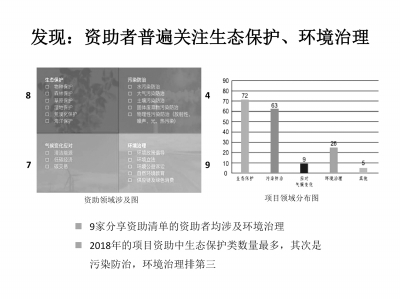 11月23日,環(huán)境資助者網(wǎng)絡(luò)(英文簡稱CEGA)在2018中國基金會發(fā)展論壇年會上發(fā)布了《2018環(huán)境資助者網(wǎng)絡(luò)(CEGA)報告》。(以下簡稱《報告》)。 《報告》對2018年我國環(huán)保公益領(lǐng)域主要資助者的資助信息和資助成果進行了集中展示,通過信息匯總、案例分析、資助者訪談等方式,透視環(huán)保公益現(xiàn)象,剖析環(huán)保公益生態(tài),研判未來發(fā)展趨勢。 《報告》顯示,2018年CEGA中的7家基金會為中國的環(huán)保公益領(lǐng)域提供了總計約為3.25億元的資助,項目資助占總體資助的88.4%,資助組織和個人的約占11.6%,這表明國內(nèi)目前環(huán)境資助總量不大,資助者仍以項目資助為主。 《報告》認為,中國環(huán)保NGO在十年中數(shù)量和質(zhì)量都有了很大的突破,組織數(shù)量翻倍,出現(xiàn)了一批引領(lǐng)性的環(huán)保組織。但更多的環(huán)保NGO還處在發(fā)展初期,核心競爭力尚未形成,人才匱乏,人員流動大。國內(nèi)環(huán)保公益行業(yè)的捐贈方、資助者十分欠缺,需要資助者和環(huán)保組織打造事業(yè)共同體,推進環(huán)保公益事業(yè)向前發(fā)展。 《報告》指出,環(huán)保公益未來將集中體現(xiàn)在四大方向上,機會空間挑戰(zhàn)不一。在生態(tài)保護領(lǐng)域,科學(xué)性和專業(yè)性將會越來越強;在污染防治領(lǐng)域,發(fā)展不均,污染調(diào)研、企業(yè)監(jiān)督比較成熟,而水保護和廢棄物管理仍需提升;在應(yīng)對氣候變化領(lǐng)域,“基礎(chǔ)設(shè)施”不足,挑戰(zhàn)大,潛力也大,林業(yè)是其中的重要手段;在環(huán)境治理領(lǐng)域,仍處在摸索階段,需要與國家的環(huán)境治理體制相協(xié)調(diào),并提高公眾參與能力。 環(huán)境資助者網(wǎng)絡(luò)是中國環(huán)境資助者交流合作的平臺,由阿拉善SEE基金會、北京巧女公益基金會、紅樹林基金會、老?;饡?、千禾社區(qū)基金會、桃花源生態(tài)保護基金會、萬科公益基金會、中國綠色碳匯基金會、中華環(huán)境保護基金會、自然之友基金會、阿里巴巴公益基金會11家基金會于2018年1月29日聯(lián)合發(fā)起創(chuàng)立。CEGA旨在促進環(huán)境領(lǐng)域資助者的合作與發(fā)展,引導(dǎo)更多資金進入環(huán)境公益領(lǐng)域,實現(xiàn)環(huán)境領(lǐng)域慈善資金社會效益最大化。 “我們通過報告?zhèn)鬟f目前環(huán)境資助領(lǐng)域的關(guān)鍵信息,給大家的工作提供一些參考和借鑒,同時更希望可以啟發(fā)大家從戰(zhàn)略慈善的角度探索中國環(huán)境資助方向,以實現(xiàn)環(huán)境資助領(lǐng)域社會效益最大化。”CEGA首任聯(lián)席主席阿拉善SEE基金會秘書長張立強調(diào)。 五大發(fā)現(xiàn)透視資助現(xiàn)狀 環(huán)境問題是社會焦點,環(huán)境資助總量規(guī)模較小也一直制約著我國環(huán)保公益事業(yè)的發(fā)展。《報告》對11家CEGA成員單位資助情況進行了深入分析,呈現(xiàn)了環(huán)境公益領(lǐng)域的資金投入規(guī)模、投入方向、地區(qū)特點,為業(yè)內(nèi)把脈環(huán)境資助領(lǐng)域的發(fā)展提供了有益參考。 資助體量偏小。從資助金額來看,近一半的項目資助在10萬~50萬元之間,其次是10萬元以下的資助占近1/3,另有10個項目為50萬~100萬元,20個項目在100萬~500萬元,6個項目在500萬~1000萬元之間,資助金額超過1000萬元的項目有3個。這表明我國現(xiàn)階段環(huán)保公益項目的體量還比較小,超過80%的項目資金額度在50萬以內(nèi)。同時報告顯示,在對組織/個人資助金額上,10~50萬之間占64%,10萬元以下占31%,100萬以上占5%。6家組織獲得的7項組織資助超過100萬,其中4家組織為阿里巴巴公益基金會的XIN伙伴戰(zhàn)略合作伙伴,均屬于水污染防治的細分領(lǐng)域。 生態(tài)保護、環(huán)境治理領(lǐng)域關(guān)注多。從環(huán)保公益資金投入的具體領(lǐng)域來看,生態(tài)保護最多,占43%;其次是污染防治占37%;環(huán)境治理占16%;應(yīng)對氣候變化的項目較少,占4%。報告顯示,2018年的項目資助中,9家分享資助清單的資助者均涉及環(huán)境治理。 細分領(lǐng)域有三大熱門。在細分領(lǐng)域中,物種保護、水污染防治和自然教育成為三大熱門。物種保護涉及項目53個,水污染防治涉及項目48個,自然教育涉及項目30個,這三個領(lǐng)域涉及項目數(shù)量遠遠超過其他細分領(lǐng)域,得到資助者普遍關(guān)注。 大部分資助項目落地華東、華南。9家資助者資助最多的是全國性項目。其他項目從地域分布來看,在華東、華南地區(qū)開展的項目資助最多,均超過30個;其次是華北、西南、華中地區(qū);西北和東北地區(qū)最少。在項目資助最為集中的華東地區(qū)及廣東省,生態(tài)保護和污染防治類項目最多。 效果評估以基金會評估為主。對資助項目的效果評估,由基金會評估的占71%,第三方評估占11%。資助的監(jiān)測評估,除了提交完整的項目實施、財務(wù)報告,電話、郵件、會面、實地走訪等形式了解項目實施情況外,阿里巴巴公益基金會和老?;饡τ谫Y助的項目或組織會采用第三方評估,阿拉善SEE基金會對于品牌項目進行整體第三方評估,千禾社區(qū)基金會會旁聽或參與伙伴機構(gòu)的重要會議和活動,并在結(jié)項前參與合作伙伴的集體總結(jié)會議,萬科公益基金會認為監(j