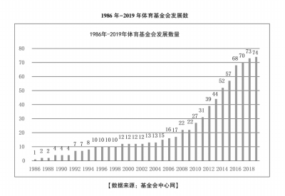 1986年10月30日,第一家體育基金會——四川省發(fā)展職工體育基金會成立以來,體育基金會數(shù)量保持緩慢增加;在2010年前的24年間,保持每年平均增長1家;2010年后的9年間,每年平均增長5家。
