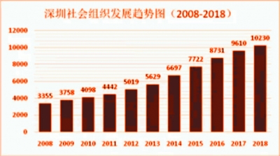 從登記數(shù)量來看,深圳市的社會(huì)組織總量從2008年的3355家,以11.79%的年平均增長率增長至2018年的10230家;每萬名常住人口擁有社會(huì)組織的數(shù)量從2008年的3.52個(gè),增長到2018年的8.03個(gè),萬人社會(huì)組織擁有量居全國一線城市之首。