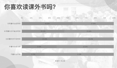 ■ 本報記者 皮磊 12月4日,上海享物公益基金會聯(lián)合“十點讀書”發(fā)布《城鄉(xiāng)小學生閱讀及生活現(xiàn)狀白皮書》。此次調(diào)研主要針對“城鄉(xiāng)小學生閱讀習慣、閱讀動力、書籍來源、基本生活物資保障、文娛生活、心理現(xiàn)狀”等問題,面向中國城鄉(xiāng)3至6年級的小學生取樣,通過問卷調(diào)查的形式進行數(shù)據(jù)收集。該調(diào)研覆蓋城市小學29所、山區(qū)小學14所,共回收有效數(shù)據(jù)超過8000份。 據(jù)介紹,本次白皮書調(diào)研目的是為進一步深入了解當?shù)貙W生需求,為如何拓展書籍廣度和渠道、營造閱讀氛圍、連接城市及山區(qū),更合理利用社會資源等課題提供數(shù)據(jù)支持。 調(diào)研結果顯示,山區(qū)學生仍然缺乏充分的書籍資源。數(shù)量及種類的不足,閱讀氛圍的缺失都容易造成偏向?qū)嵉拈喿x取向及以興趣為出發(fā)點的閱讀動力不足; 山區(qū)學生文娛及體育活動缺乏,需要得到社會的持續(xù)關注和支持,才有希望盡早在山區(qū)中成功開展素質(zhì)教育,以拉近城市與山區(qū)的鴻溝; 山區(qū)孩子的基本物質(zhì)生活還沒得到足夠保障,應該進一步搭建起城市與山區(qū)的共享橋梁,將更多城市剩余的優(yōu)質(zhì)生活物品輸送到山區(qū)當中去; 陪伴的缺失正深刻影響著山區(qū)孩子的健康心理形成,孩子對關愛的呼喚應該引起全社會的重視,不應再讓孩子在孤獨的氛圍中成長。 山區(qū)學生平均認知輸入遠低于城市學生 數(shù)據(jù)顯示,有3.5%的山區(qū)學生從來不看課外書;閱讀課外書在三本以下的山區(qū)學生比城市學生多10%左右;閱讀課外書五本以上的城市學生比山區(qū)學生多12%左右;非常喜歡也經(jīng)常讀課外書的城市學生比山區(qū)學生多近10%;非常喜歡,但不經(jīng)常讀課外書的山區(qū)學生和城市學生比例都高于20%。 白皮書指出,城市學生與山區(qū)學生看書的極端值差距較大。山區(qū)學生一學期不讀課外書的人數(shù)是城市學生的3.5倍,而閱讀五本以上的人數(shù)則比城市學生少近10%。閱讀是孩子認識世界的重要途徑,山區(qū)學生可能在平均認知輸入上少于城市學生。 在是否能意識到閱讀讀課外書可以擴大知識面的話題上,城市學生比山區(qū)學生多將20%;因為內(nèi)容有趣而去閱讀的比例,城市學生比山區(qū)學生多40%。比例相差驚人。對于經(jīng)常閱讀的圖書類型,66.9%的城市學生有涉獵科普類型的書籍,而山區(qū)學生的比例只有27.8%。貧困山區(qū)書籍數(shù)量不足以及書本種類不全,都會導致閱讀面狹窄及閱讀興趣培養(yǎng)難等問題。 結論表明,閱讀是孩子認識世界的重要途徑,在此現(xiàn)狀下,山區(qū)學生在平均認知輸入上遠少于城市學生。偏遠地區(qū)對于學生閱讀習慣的培養(yǎng)仍需投入更多資源及精力,如果沒有穩(wěn)定獲取圖書的途徑將嚴重影響山區(qū)學生閱讀習慣形成。 山區(qū)學生缺少父母陪伴 數(shù)據(jù)顯示,在周末,幫家長干活的山區(qū)學生比城市學生多16.2%;參加體育活動的城市學生比山區(qū)學生多近30%;上輔導班的城市學生比山區(qū)學生多出近50%。所有周末活動中,僅有幫家長干活這一項,山區(qū)學生所占比例高于城市學生。 分析表明,相比城市學生,偏遠山區(qū)學生接受到輔導類知識輸入、健身及娛樂類的活動明顯偏少。而體育文娛等活動可以讓學生活躍思維,強身健體,相關設備及條件的缺乏導致城市和山區(qū)之間仍存在鴻溝。 在與父母相處時間方面,僅有2.3%的城市學生不能天天見到父母,而山區(qū)學生此比例超過一半;13.4%的山區(qū)學生半年及以上見一次父母;超83%的城市學生表示經(jīng)常受到父母的輔導,而山區(qū)學生的比例僅半數(shù)左右;有10%左右的山區(qū)學生父母從不輔導孩子作業(yè)。 當在生活中遇到困難時,92%左右的城市學生愿意向父母或親人傾訴;超過20%的山區(qū)學生選擇誰都不說,默默藏在心里。 這一結果表明,山區(qū)學生的“孤讀”現(xiàn)象明顯,無論學習還是生活都缺乏基本的輔導和陪伴,而父母長期缺位會直接影響孩子傾訴的欲望,從而導致超過20%的學生不愿意分享心事,長期以往對學生的心理健康將造成非常負面的影響。 山區(qū)孩子物質(zhì)保障仍然缺乏 在物質(zhì)生活層面,山區(qū)孩子與城市孩子相比仍有很大欠缺。例如,在多久給孩子購買新衣服問題上,每個月都會購買的比例,山區(qū)學生和城市學生相差不大;半年及以上才會置辦的比例,山區(qū)學生比城市學生多出近10%。收到偏娛樂屬性禮物的城市學生比例高出山區(qū)學生近14%;收到實用性禮物的山區(qū)學生比城市學生多出10%左右。 對孩子而言,因為學業(yè)相關內(nèi)容感到開心的城市學生比山區(qū)學生多出9%;因家人朋友陪伴感到開心的山區(qū)學生比例高出城市學生20%。因為學業(yè)相關內(nèi)容感到不開心的城市學生比山區(qū)學生多出近15%;因為缺乏陪伴而感到不開心的山區(qū)學生比例高出城市學生近13%。 白皮書顯示,城市學生的心情受到學習成績影響明顯,側面可以看出城市家庭對于孩子學習的重視程度高;山區(qū)孩子由于父母陪伴缺失,對于陪伴相關的需求遠高于城市孩子,是否能得到父母的情感關注和關愛直接牽動孩子的情緒。 對于未來職業(yè)的選擇,城市學生和山區(qū)學生整