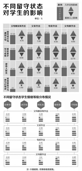 ■ 本報(bào)記者 王勇 2020年1月,北京上學(xué)路上公益促進(jìn)中心發(fā)布了《2019年度中國(guó)留守兒童心靈狀況白皮書(shū)》?!栋灼?shū)》的關(guān)鍵詞為“教·養(yǎng)”,從對(duì)留守兒童本身的調(diào)查研究,延伸到了他們身后的父母、家庭、校園、朋友。 據(jù)了解,2019白皮書(shū)研究報(bào)告從2019年3月啟動(dòng),歷時(shí)10個(gè)月,涉及15個(gè)省、自治區(qū)、直轄市,問(wèn)卷樣本總數(shù)為14000份。與此前4年的白皮書(shū)報(bào)告的調(diào)查過(guò)程不同,2019年的調(diào)查首次實(shí)施面對(duì)面訪談,留守家庭入戶家訪地區(qū)涉及河南省洛陽(yáng)市嵩縣、安徽省六安市獅子崗鄉(xiāng)、甘肅省平?jīng)鍪嗅轻紖^(qū)、云南省騰沖市騰越鎮(zhèn)四個(gè)地區(qū),共計(jì)入戶探訪超100個(gè)留守家庭。 《白皮書(shū)》對(duì)江西、安徽和云南三省2763份實(shí)證數(shù)據(jù)進(jìn)行分析。數(shù)據(jù)表明,調(diào)查地區(qū)兒童遭受暴力對(duì)待主要分為軀體遭受暴力對(duì)待、精神遭受暴力對(duì)待、性遭受暴力對(duì)待和忽視四類(lèi),發(fā)生率分別達(dá)到65.1%、91.3%、30.6%和40.6%。值得關(guān)注的是,這其中有13.7%的兒童遭受四重暴力。 親子分離和隔代教養(yǎng)產(chǎn)生較大影響 據(jù)民政部公布的數(shù)據(jù),2018年,全國(guó)共有農(nóng)村留守兒童697萬(wàn)余人,96%的農(nóng)村留守兒童由祖父母或者外祖父母照顧。 由于父母雙方或一方不在身邊,留守兒童多由祖輩進(jìn)行照顧,這種養(yǎng)育方式也導(dǎo)致留守兒童在教育和成長(zhǎng)過(guò)程中呈現(xiàn)出“親子分離”和“隔代教養(yǎng)”的特征。 通過(guò)對(duì)農(nóng)村非留守兒童、農(nóng)村留守兒、農(nóng)民工隨遷子女三類(lèi)兒童的數(shù)據(jù)比較,研究發(fā)現(xiàn)親子分離和隔代教養(yǎng)對(duì)兒童的親子互動(dòng)形式、教育方式等產(chǎn)生明顯的影響,對(duì)于兒童的心理發(fā)展、行為養(yǎng)成等社會(huì)化過(guò)程會(huì)產(chǎn)生較大影響。 從親子互動(dòng)形式上看,看護(hù)人擁抱撫摸孩子以及與孩子說(shuō)笑玩耍情況方面,留守兒童和非留守兒童相似,低于隨遷子女家庭情況。從親子互動(dòng)內(nèi)容上看,與孩子聊有興趣的東西情況,留守兒童低于非留守兒童,遠(yuǎn)低于隨遷子女。與孩子聊每天過(guò)得怎么樣,留守兒童明顯低于非留守兒童,低于隨遷子女。 在親子日?;?dòng)上,留守兒童很少和父母一起吃飯,非留守兒童和隨遷子女較多,85%的兒童至少每天一次。此外,留守兒童和非留守兒童很少和父母一起做活動(dòng),隨遷子女兒童最高。 在親子外出休閑上,隨遷子女外出頻率較多,農(nóng)村留守兒童少于非留守兒童。帶孩子參觀博物館、聽(tīng)音樂(lè)會(huì)、聽(tīng)?wèi)蚍矫?,留守兒童少于非留守,二者均遠(yuǎn)低于隨遷子女。 再者,三類(lèi)兒童在教育方式上同樣出現(xiàn)明顯差異,留守兒童的看護(hù)人較少與孩子討論學(xué)習(xí)狀況,給孩子的信息少。 此外,三類(lèi)兒童在教育資源上有明顯差異: 55.3%的留守兒童所在的學(xué)校沒(méi)有圖書(shū)館、而非留守兒童和隨遷子女在此方面的比例為46.2%、28%。 62.3%的留守兒童所在的學(xué)校沒(méi)有計(jì)算機(jī)房、而非留守兒童和隨遷子女在此方面的比例為50.9%、27.6%。 47.5%的留守兒童父母不知道孩子的班主任是誰(shuí)、而非留守兒童和隨遷子女在此方面的比例為37.4%、18.4%。 中國(guó)勞動(dòng)關(guān)系學(xué)院社會(huì)工作學(xué)院副教授葉鵬飛建議,在農(nóng)村中建立社會(huì)工作站,從各個(gè)方面對(duì)留守兒童教育和成長(zhǎng)發(fā)揮積極影響。比如建立農(nóng)村留守兒童的教育支持小組,通過(guò)來(lái)自組員和朋友之間的關(guān)愛(ài)、傾訴來(lái)提供支持,緩解他們對(duì)于父母的思念,疏解負(fù)面情緒等。 但目前農(nóng)村社會(huì)工作仍比較滯后,農(nóng)村社會(huì)組織培育存在不足。 遭受暴力對(duì)待問(wèn)題不容忽視 此次《白皮書(shū)》披露的兒童遭受暴力對(duì)待的問(wèn)題同樣不容忽視。 2019年,《白皮書(shū)》對(duì)江西、安徽和云南三省2763份實(shí)證數(shù)據(jù)進(jìn)行分析。數(shù)據(jù)表明,調(diào)查地區(qū)兒童遭受暴力對(duì)待主要分為軀體遭受暴力對(duì)待、精神遭受暴力對(duì)待、性遭受暴力對(duì)待和忽視四類(lèi),發(fā)生率分別達(dá)到65.1%、91.3%、30.6%和40.6%。值得關(guān)注的是,這其中有13.7%的兒童遭受四重暴力。 對(duì)于軀體暴力和精神暴力,家庭和學(xué)校是發(fā)生的兩個(gè)主要場(chǎng)所。其中,軀體暴力主要發(fā)生在學(xué)校中,這表明校園欺凌,包括老師的體罰和學(xué)生之間的欺凌,成為兒童暴力的“重災(zāi)區(qū)”,精神暴力主要發(fā)生在家庭領(lǐng)域中,留守兒童遭受辱罵、歧視等精神暴力最多,其發(fā)生率達(dá)到86%以上,具有一定的普遍性。 《白皮書(shū)》對(duì)遭受暴力對(duì)待后兒童心理發(fā)展進(jìn)行的均值分析表明,遭受暴力對(duì)待對(duì)兒童心理發(fā)展具有負(fù)面影響。整體上,受到暴力對(duì)待后兒童自尊、抗逆力、情緒力和社交力均有下降,下降幅度最高可達(dá)到10.6%。 值得注意的是,與以往研究結(jié)果不同,本次調(diào)