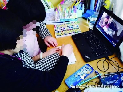 針對武漢市心智障礙兒童在疫情期間無法持續(xù)進行康復(fù)訓(xùn)練和特殊教育等問題,愛特中心發(fā)起了“云端有愛,線上無礙”項目。圖為孩子在家長陪伴下接受一對一線上康復(fù)指導(dǎo)課程