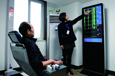 洛陽市英才社區(qū)智慧養(yǎng)老服務中心的工作人員在為老人講解儀器檢測得出的各項身體情況數值(新華社記者 李安/攝)