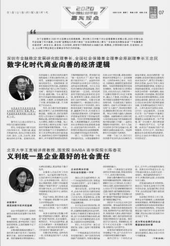 在疫情中 感受到數(shù)字技術(shù)的溫暖 2020年的疫情當(dāng)中,給我們感受最深的其實(shí)是數(shù)字技術(shù)的溫暖。 在那樣一個(gè)信息爆炸,真假難辨的時(shí)候,數(shù)字技術(shù)給了我們很好的幫助,讓我們能夠平定下來(lái),清晰下來(lái)。 在物理距離隔離的情況下,我們因?yàn)閿?shù)字技術(shù)有了很好的解決方案:我們對(duì)病毒漸漸了解,我們能夠?qū)崟r(shí)看到雷神山、火神山的建設(shè),都是借助于數(shù)字技術(shù)。 在很多人無(wú)法正常工作的情況下,也正是因?yàn)閿?shù)字技術(shù),讓我們都可以在線展開(kāi)自己的工作,讓生活恢復(fù)正常。我自己是從事教育的,在那個(gè)時(shí)間教育部提出“停課不停學(xué)”,也恰恰是因?yàn)閿?shù)字技術(shù),讓幾乎所有的同學(xué)能夠很好地在線學(xué)習(xí),獲得應(yīng)有的知識(shí)。 在這個(gè)時(shí)間,我們所有人都有一個(gè)健康碼,幫助整個(gè)社會(huì)努力去正常地運(yùn)轉(zhuǎn)。 這些就是數(shù)字技術(shù)給我們帶來(lái)的巨大幫助,每個(gè)人感同身受。 很多企業(yè)所展示的魅力和能力更值得我們?nèi)ゾ囱?。就在武漢“封城”的時(shí)刻,無(wú)論是騰訊、阿里巴巴、華為還是新希望,都在當(dāng)天就展開(kāi)一系列馳援武漢的動(dòng)作。我們也有非常多的醫(yī)務(wù)工作者成為“最美的逆行者”。 在數(shù)字技術(shù)背后,這所有的一切,其實(shí)都是我們每個(gè)人在承擔(dān)責(zé)任。 企業(yè)的商業(yè)價(jià)值 和社會(huì)價(jià)值缺一不可 我自己在企業(yè)的研究中,有一個(gè)方向是特別關(guān)注的,那就是“企業(yè)社會(huì)責(zé)任”。這個(gè)主題在今天顯現(xiàn)得更加重要。 我們會(huì)發(fā)現(xiàn),由于數(shù)字技術(shù),企業(yè)內(nèi)外責(zé)任的關(guān)聯(lián)性更加凸顯,沒(méi)有一個(gè)企業(yè)可以僅僅限于企業(yè)內(nèi)部;更重要的是,你能不能在外部被檢驗(yàn),其中很重要的是道德因素。 在討論企業(yè)價(jià)值的時(shí)候,我們今天不僅僅只討論它的商業(yè)價(jià)值,還要特別強(qiáng)調(diào)它的社會(huì)價(jià)值。如果它不能夠真正解決商業(yè)價(jià)值,這個(gè)企業(yè)就沒(méi)有能力存活;如果這個(gè)企業(yè)不能夠創(chuàng)造社會(huì)價(jià)值,它就沒(méi)有辦法持續(xù)發(fā)展。 所以,今天在評(píng)估一家公司的時(shí)候,實(shí)際上是兩個(gè)維度都需要展開(kāi): 一個(gè)維度就是它有沒(méi)有業(yè)務(wù)發(fā)展的能力、客戶喜歡的持續(xù)創(chuàng)新產(chǎn)品的能力、為股東提供最好回報(bào)的能力; 另外一個(gè)維度是它還需要承擔(dān)對(duì)世界的貢獻(xiàn),幫助改善每一個(gè)人,而且長(zhǎng)期可持續(xù)。 我參與提升騰訊的企業(yè)使命和價(jià)值觀時(shí)就曾思考,當(dāng)騰訊成為影響十幾億人日常生活、社交和工作的公司時(shí),其技術(shù)到底應(yīng)用于什么方向?可不可以旗幟鮮明地對(duì)自己提出要求?能不能幫助改善每一個(gè)人?能不能對(duì)整個(gè)世界做出貢獻(xiàn)?騰訊的“科技向善”就在這個(gè)背景下被我們確定下來(lái)。 我們?cè)诮裉煊懻撈髽I(yè)社會(huì)價(jià)值的時(shí)候,更關(guān)注的是你的總價(jià)值曲線:你能否真正承擔(dān)商業(yè)的價(jià)值,提供好的產(chǎn)品;能否真正盈利,幫助更多人就業(yè);能否為股東提供回報(bào)。同時(shí),我們還特別在意你能否幫助所在行業(yè)發(fā)展,能否真正與行業(yè)共生。更重要的是,我們今天又對(duì)企業(yè)提一個(gè)新的期待,你能否以與社會(huì)共生。 如果我們能夠把這些總的價(jià)值確定下來(lái),這個(gè)企業(yè)在今天才擁有持續(xù)發(fā)展的可能性。 我自己作為一個(gè)研究企業(yè)的人,在今年2月份接到無(wú)數(shù)電話,很多企業(yè)不知道怎么辦,也不知道應(yīng)該怎么去面對(duì)這樣一場(chǎng)危機(jī)。我在最短的時(shí)間寫了一本書,叫做《危機(jī)自救:企業(yè)逆境生存之道》。 在快速寫就這本書的時(shí)候,我訪問(wèn)了很多在逆境當(dāng)中仍然生存的企業(yè),發(fā)現(xiàn)他們得以存活下來(lái),完全都是基于最樸素的責(zé)任和擔(dān)當(dāng)。 比如他們希望員工有工資,希望企業(yè)不要倒閉,讓顧客能夠持續(xù)獲得服務(wù),希望能夠真正通過(guò)捐贈(zèng)幫助到身處疫情困境中的人和組織戰(zhàn)勝挑戰(zhàn)。所有這些都是基于他們對(duì)于社會(huì)責(zé)任的理解,而這也讓他們?cè)谖C(jī)當(dāng)中反而活了下來(lái)。 成為有社會(huì)責(zé)任的企業(yè) 需要做好四件事 如果我們要構(gòu)建企業(yè)社會(huì)責(zé)任的新模式,我認(rèn)為至少有四個(gè)關(guān)鍵要素。 (下轉(zhuǎn)08版) |