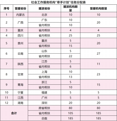 ■ 本報記者 李慶 近日,民政部、國家鄉(xiāng)村振興局聯合印發(fā)《“十四五”時期社會工作服務機構“牽手計劃”實施方案》(以下簡稱《方案》)的通知,明確“十四五”時期繼續(xù)實施社會工作服務機構“牽手計劃”(以下簡稱“牽手計劃”),要求至2025年,以160個國家鄉(xiāng)村振興重點幫扶縣為主,從社會工作先發(fā)地區(qū)遴選一批社會工作服務機構一對一牽手幫扶受援地區(qū),力爭實現受援地區(qū)縣域鄉(xiāng)鎮(zhèn)(街道)社會工作服務站全覆蓋。培育一批政治可靠、成效突出、管理規(guī)范的社會工作服務機構,培養(yǎng)一批扎根鄉(xiāng)村、能力突出的社會工作專業(yè)人才,協助受援地區(qū)建立完善社會工作服務制度,提高社會工作服務水平,搭建社會工作服務東西部協作、城鄉(xiāng)融合平臺,推動社會工作專業(yè)人才在鞏固脫貧攻堅成果同鄉(xiāng)村振興有效銜接中發(fā)揮更大作用。 “牽手計劃”的實施是結合各地鄉(xiāng)村振興和鄉(xiāng)鎮(zhèn)(街道)社會工作服務站建設實際需要,確定一批受援機構,建立援派機構和受援機構一對一結對幫扶關系,實現國家鄉(xiāng)村振興重點幫扶縣“牽手計劃”全覆蓋。鼓勵結合援藏、援疆工作實際,選派社會工作服務機構對口幫扶西藏自治區(qū)和新疆維吾爾自治區(qū)社會工作服務機構。鼓勵延續(xù)往年“牽手計劃”實施任務,拓展受益范圍,創(chuàng)新實施方式,結合各地鄉(xiāng)村振興和鄉(xiāng)鎮(zhèn)(街道)社會工作服務站建設實際需要,多方籌集財政資金、彩票公益金和社會資金等,開展結對幫扶工作。 幫扶方式分為跨省幫扶和省內幫扶兩類。跨省幫扶由社會工作先發(fā)地區(qū)省級民政部門與國家鄉(xiāng)村振興重點幫扶縣所在省級民政部門協作實施。省內幫扶由省級民政部門在本?。▍^(qū)、市)內組織實施。有關省級民政部門根據任務表擇優(yōu)遴選援派機構和受援機構。援派機構和受援機構應是社會工作服務機構、兒童福利機構、老年人福利機構、救助保護機構、特困人員供養(yǎng)服務機構、優(yōu)撫安置服務機構、殘疾人福利與服務機構、青少年服務機構、婦女兒童援助機構等法人單位。遴選援派機構應綜合考察政治立場堅定、管理規(guī)范、服務專業(yè)、群眾認可等條件,遴選受援機構應綜合考慮受援地區(qū)社會工作服務需求、工作基礎等條件。 在幫扶任務方面,要求援派機構要支持受援地區(qū)建立鄉(xiāng)鎮(zhèn)(街道)社會工作服務站。援派機構重點支持受援地區(qū)建設一批鄉(xiāng)鎮(zhèn)(街道)社會工作服務站,建立完善管理制度,優(yōu)化服務清單,重點做好社會救助對象、老年人、未成年人等特殊困難群眾基本生活保障、社區(qū)融入和社會參與工作,打造一批群眾認可、特色鮮明、具有示范帶動作用的社會工作服務品牌項目。 發(fā)展社會工作服務機構。通過政府購買服務、公益創(chuàng)投、設立基金、項目合作、專業(yè)扶持等方式,孵化培育一批社會工作服務機構,幫扶受援機構提升內部治理、專業(yè)服務、資源整合和組織發(fā)展能力。 培養(yǎng)社會工作專業(yè)人才。引導、鼓勵受援機構相關人員接受社會工作專業(yè)培訓,參加全國社會工作者職業(yè)水平考試。援派機構定期選派資深社會工作者到受援機構開展培訓、督導和項目指導等,提升本地社會工作者專業(yè)水平。 建立社會工作發(fā)展制度。進一步暢通和規(guī)范社會工作助力鄉(xiāng)村振興的途徑與方式,探索建立健全農村地區(qū)社會工作發(fā)展制度,逐步提升農村地區(qū)社會工作服務機構水平,充實壯大農村地區(qū)基層民政工作力量,探索形成符合農村地區(qū)特點的社會工作發(fā)展模式。 具體工作步驟如下。 制定實施方案。各有關省級民政、鄉(xiāng)村振興部門要按照任務表,確定援派機構與受援機構名單,明確一對一結對幫扶關系,制定具體實施方案。2022年1月25日前經援派省份和受援省份省級民政、鄉(xiāng)村振興部門審核后,將具體實施方案分別報民政部慈善事業(yè)促進和社會工作司、國家鄉(xiāng)村振興局社會幫扶司。 落實幫扶任務。各有關省級民政、鄉(xiāng)村振興部門要指導援派機構與受援機構共同落實方案規(guī)定的各項幫扶任務,加強對國家鄉(xiāng)村振興重點幫扶縣的傾斜支持力度。每個工作年度援派機構應選派至少2名社會工作專業(yè)人才開展幫扶,派出人員應取得全國社會工作師職業(yè)水平證書,且直接從事社會工作服務2年以上;受援機構應選派至少3名社會工作專業(yè)人才接受幫扶。每個工作年度援派社會工作專業(yè)人才參與計劃時間累計不少于40個工作日,接受幫扶的社會工作專業(yè)人才參與計劃時間累計不少于120個工作日。 開展總結評估。各有關省級民政、鄉(xiāng)村振興部門要定期跟蹤掌握“牽手計劃”實施情況,總結好的經驗做法,研究解決實施中遇到的困難和問題;年度幫扶任務結束時,及時對“牽手計劃”進行總結與評估,形成書面情況分別報民政部慈善事業(yè)促進和社會工作司、國家鄉(xiāng)村振興局社會幫扶司。 《方案》也提出了相應保障措施。 加強經費保障。民政部采取補助方式,按照跨省幫扶3萬元/家和省內幫扶2萬元/家的標準,每年向援派機構補助資金。各省級民政部門按照本