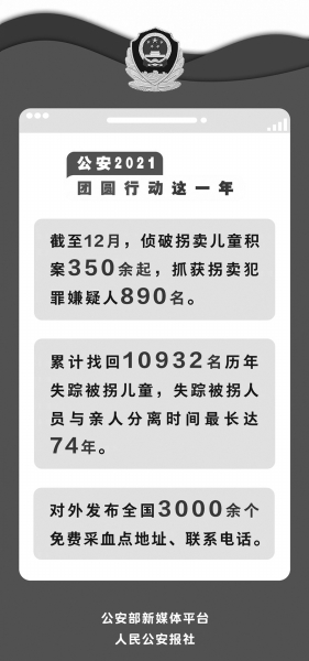 在四川省綿陽市公安局狹長的走廊通道里,王玉菊(化名)夫婦來回踱著步,焦急地等待著DNA比對結果。 32年里,王玉菊夫婦沒有停止過對雙胞胎女兒的尋找。得知公安機關正在全國范圍內開展‘團圓’行動,他們馬上到當地公安機關尋求幫助。 ‘每一個失散親人的家庭,都有一段不堪回首的尋親之苦和骨肉分離的思念之痛,都渴望早日找回親人、全家團圓。為離散家庭消除痛苦、實現團圓是我們公安機關的重大責任?!膊啃淌聜刹榫窒嚓P負責人說。 2021年,全國公安機關開展為期一年的‘團圓’行動,全力偵破拐賣兒童積案、全力緝捕拐賣兒童犯罪嫌疑人、全面查找失蹤被拐兒童。截至2021年12月,已找回歷年失蹤被拐兒童10932名。 “看到失散多年的家庭團聚,再苦再累都值得” “沒錯!就是她們!”經過反復的遺傳信息核查和人像比對,最終確認福建汪銀銀(化名)和安徽趙珊(化名)的生物信息與王玉菊夫婦吻合,屬于親子關系。民警胡祥雨興奮地把檢驗結果第一時間告訴了王玉菊夫婦。 胡祥雨,來自綿陽市公安局刑偵支隊,主要負責打拐工作?!皥F圓”行動開展以來,為了讓群眾尋親更加方便,綿陽公安機關在重點地區(qū)成立了3個以打拐民警名字命名的反拐尋親工作室,“胡祥雨工作室”就是其中之一。以工作室為依托,截至2021年12月13日,胡祥雨和當地打拐民警一共幫助116個家庭實現了團圓。 汪銀銀和趙珊的信息雖然比對成功了,但還有一件事像一塊石頭一樣壓在胡祥雨心里?!罢业胶⒆又皇菑碗s工作的第一步?!焙橛暾f。 原來,由于事發(fā)突然,汪銀銀和趙珊沒有思想準備,對認親抱有一些抵觸情緒。 胡祥雨反復通過短信、電話、微信聯系,并專程跑到福建、安徽,與汪銀銀和趙珊不斷溝通,解釋情況,終于獲得了她們的理解和信任。2021年10月30日,在綿陽公安的見證下,失散32年的王玉菊一家重獲團圓。 “感謝你們的辛苦付出,你們真是人民英雄!”王玉菊抱著兩個女兒,激動地對胡祥雨等民警表示感謝。 安徽省公安廳刑警總隊“打拐辦”負責人楊菁表示,“雖然大家長期超負荷工作,但每當看到失散多年的家庭團聚,再苦再累都值得!” “每位民警都承擔數項任務,嚴格意義上的專職打拐民警沒有幾個人。大家的任務特別重,可就是在這種情況下,我們的民警依然奮戰(zhàn)在打拐工作第一線,為的就是努力讓更多家庭實現團圓?!睏钶冀榻B,很多民警發(fā)現了線索就住在當地,一遍遍地采集信息、血樣,反復走訪摸排,如同是在找尋自己的親人。 “公安機關更加有能力、有條件承擔起這份重任” “團圓”行動中,找到的失蹤被拐人員與親人分離時間最長達74年。 “受限于技術條件等原因,以前很多失蹤被拐兒童案件沒有得到及時偵破。隨著DNA技術和人像比對技術不斷發(fā)展、公安辦案能力持續(xù)提升、打拐工作機制不斷完善,尤其是公安部部署開展命案積案攻堅行動以來,各地公安機關在組織指揮、技術支撐、區(qū)域協作等方面積累了豐富經驗。”公安部刑偵局副局長童碧山介紹。 人民群眾期盼的,人民警察一直沒有放棄。“現在,公安機關更加有能力、有條件主動承擔起這份重任?!蓖躺秸f。 “我覺得差不多了,肯定是這個!”參加“團圓”行動刑事技術集中比對會戰(zhàn)的民警李海燕很自信。 2021年5月的一天,天津市公安局刑偵總隊刑事技術專家呂游正拿著一張被拐男孩祁吉5歲時的照片在電腦屏幕前仔細做著對比,突然發(fā)現一名廣東省汕頭市的男子和祁吉的五官特征高度相似,馬上請李海燕幫忙聯系地方公安機關核查。 “通過對祁吉小時候的照片進行技術增強和清晰化處理,我們得到了200多個高度相似的照片,經過兩天不斷甄別篩選,最終找到一個生物特征最符合的男孩,反復比對分析后,最終確認這個男孩就是祁澤華、龍大娥夫婦失散25年的兒子?!眳斡握f。 “人像比對技術之前不成熟,準確率低,沒有大范圍應用在打拐領域,這幾年通過不斷迭代發(fā)展,人像比對技術準確率有了大幅提升?!?021年9月,呂游再次參加公安部組織的第二次技術比對會戰(zhàn),每天依舊工作近10個小時,查看上千張照片,但他覺得很有成就感,“我們甚至還比中過一張被拐兒童的百日照”。 同樣參加過技術比對會戰(zhàn)的公安部物證中心情報處處長劉冰介紹,將DNA技術與人像比對技術成功融合,是這次“團圓”行動最大的技術嘗試和突破,得到了“1+1>2”的效果。 據介紹,目前,我國DNA檢測技術和數據信息庫建設處于世界一流水平,檢驗方法穩(wěn)定可靠,識別準確率越來越高,為找到失蹤被拐兒童提供了強有力的支撐,成為這次“團圓”行動取得豐碩戰(zhàn)果的重要原因之一。 “繼續(xù)加大宣傳力度,幫助更多的離散家庭團聚” “團圓行動,免費采集DNA”“圓夢有路 助愛回家”“你和你的親人只差一滴血的距離”,在失蹤被拐兒童案件發(fā)生的重點地區(qū),經常能看見印有這些宣傳標語的海報。 DNA檢測是最終認定失散家庭是否屬于親子關系的唯一辦法。但一直以來,警方掌握的血樣有限,給認定失蹤被拐兒童和父母的親子關系增加了難度。 “這次‘團圓’行動的一個重大亮點,就是廣泛宣傳動員群眾積極到公安機關采血,為失散家庭尋親提供破案線索,很大程度上提高了公安機關為失散家庭找到親人的可能?!惫膊啃虃删执蚬辙k副處長孟慶甜介紹,公安機關充分利用傳統(t