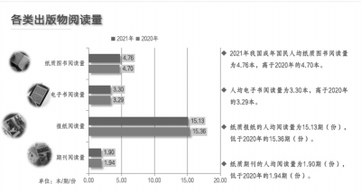 ■ 本報記者 皮磊 4月23日是第27個世界讀書日。在當(dāng)天舉行的首屆全民閱讀大會上,中國新聞出版研究院發(fā)布了第十九次全國國民閱讀調(diào)查結(jié)果。該調(diào)查自1999年開展起,如一年一度的國民閱讀‘體檢報告’,綜合反映著我國國民閱讀水平。 77.4%的成年國民 進(jìn)行過手機(jī)閱讀 調(diào)查結(jié)果顯示,2021年,,較2020年的59.5%增長了0.2個百分點(diǎn);報紙閱讀率為24.6%,較2020年的25.5%下降了0.9個百分點(diǎn);期刊閱讀率為18.4%,較2020年的18.7%下降了0.3個百分點(diǎn);數(shù)字化閱讀方式(網(wǎng)絡(luò)在線閱讀、手機(jī)閱讀、電子閱讀器閱讀、Pad閱讀等)的接觸率為79.6%,較2020年的79.4%增長了0.2個百分點(diǎn)。 進(jìn)一步對各類數(shù)字化閱讀載體的接觸情況進(jìn)行分析發(fā)現(xiàn),2021年有77.4%的成年國民進(jìn)行過手機(jī)閱讀,較2020年的76.7%增長了0.7個百分點(diǎn);71.6%的成年國民進(jìn)行過網(wǎng)絡(luò)在線閱讀,較2020年的71.5%增長了0.1個百分點(diǎn);27.3%的成年國民在電子閱讀器上閱讀,與2020年(27.2%)基本持平;21.7%的成年國民使用Pad(平板電腦)進(jìn)行數(shù)字化閱讀,與2020年(21.8%)基本持平。 從數(shù)字化閱讀方式的人群分布特征來看,越來越多的中青年群體成為數(shù)字化閱讀的主體。具體來看,在我國成年數(shù)字化閱讀方式接觸者中,18—59周歲人群占92.8%,60周歲及以上人群占7.2%。 紙質(zhì)圖書的閱讀優(yōu)勢 仍然明顯 從成年國民對各類出版物閱讀量的考察看,2021年我國成年國民人均紙質(zhì)圖書閱讀量為4.76本,高于2020年的4.70本。人均電子書閱讀量為3.30本,高于2020年的3.29本。紙質(zhì)報紙的人均閱讀量為15.13期(份),低于2020年的15.36期(份)。紙質(zhì)期刊的人均閱讀量為1.90期(份),低于2020年的1.94期(份)。 2021年我國成年國民中,有11.9%的國民年均閱讀10本及以上紙質(zhì)圖書,較2020年的11.6%增長了0.3個百分點(diǎn);有8.7%的國民年均閱讀10本及以上電子書,較2020年的8.5%增長了0.2個百分點(diǎn)。 通過對我國城鄉(xiāng)成年居民圖書閱讀量的考察發(fā)現(xiàn),2021年,我國城鎮(zhèn)居民的紙質(zhì)圖書閱讀量為5.58本,較2020年的5.54本多0.04本;農(nóng)村居民的紙質(zhì)圖書閱讀量為3.76本,高于2020年的3.75本。 “視頻講書” 成為新的閱讀選擇 從成年國民傾向的閱讀形式來看,2021年,有45.6%的成年國民傾向于“拿一本紙質(zhì)圖書閱讀”,比2020年的43.4%上升了2.2個百分點(diǎn);有30.5%的成年國民傾向于“在手機(jī)上閱讀”;有8.4%的成年國民傾向于“在電子閱讀器上閱讀”;有6.6%的成年國民傾向于“網(wǎng)絡(luò)在線閱讀”;有7.4%的成年國民傾向于“聽書”;有1.5%的成年國民傾向于“視頻講書”。 從成年國民對個人紙質(zhì)內(nèi)容和數(shù)字內(nèi)容的閱讀量變化情況的反饋來看,與上年相比,有12.2%的國民表示2021年“增加了數(shù)字內(nèi)容的閱讀”,但有8.9%的國民表示2021年“減少了數(shù)字內(nèi)容的閱讀”;有11.6%的國民表示2021年“增加了紙質(zhì)內(nèi)容的閱讀”,但有10.4%的國民表示2021年“減少了紙質(zhì)內(nèi)容的閱讀”;還有50.1%的國民認(rèn)為2021年個人閱讀量沒有變化。 調(diào)查顯示,在傳統(tǒng)紙質(zhì)媒介中,2021年我國成年國民人均每天讀書時間最長,為21.05分鐘,比2020年的20.04分鐘增加了1.01分鐘;人均每天讀報時長為5.22分鐘,少于2020年的5.71分鐘;人均每天閱讀期刊時長為2.96分鐘,少于2020年的3.25分鐘。 在數(shù)字化媒介中,成年國民人均每天手機(jī)接觸時間最長。2021年,我國成年國民人均每天手機(jī)接觸時長為101.12分鐘,比2020年的100.75分鐘增加了0.37分鐘;人均每天互聯(lián)網(wǎng)接觸時長為68.42分鐘,比2020年的67.82分鐘增加了0.6分鐘;人均每天電子閱讀器閱讀時長為11.78分鐘,較2020年的11.44分鐘增加了0.34分鐘;人均每天接觸Pad(平板電腦)的時長為9.82分鐘,較2020年的9.73分鐘增加了0.09分鐘。 全民閱讀 品牌活動效應(yīng)日漸凸顯 調(diào)查數(shù)據(jù)顯示,我國成年國民對閱讀活動的訴求較高。2021年,有80.1%的成年國民認(rèn)為當(dāng)?shù)赜嘘P(guān)部門應(yīng)當(dāng)舉辦讀書活動或讀書節(jié)。 2021年,我國成年國民對全民閱讀品牌活動的知曉率達(dá)73.1%。其中,“本地城市讀書節(jié)”和“書展書市”的知曉率最高,選擇比例均為28.8%;“機(jī)關(guān)企業(yè)/校園讀書活動”選擇比例為28.5%;“本地讀書會”“城市讀書大講堂”的知曉率選擇比例分別為26.9%和23.2%。 2021年,我國成年國民對全民閱讀品牌活動的參與度達(dá)65.4%。其中,“本地城市讀書節(jié)”的參與度為25.5%;“機(jī)關(guān)企業(yè)/校園讀書活動”的參與度位列其后,為25.3%;“本地讀書會”的參與度為24.1%;“書展書市”的參與度為23.6%;“城市讀書大講堂”的參與度為19.1%。 2021年,我國城鎮(zhèn)成年居民對居住的街道附近有公共圖書館、社區(qū)閱覽室/社區(qū)書屋/城市書房、報刊欄等至少一種公共閱讀服務(wù)設(shè)施的知曉率為51.7%。其中,對公共圖書館的知曉率為30.3%;對報刊欄的知曉率為26.5%;對社區(qū)閱覽室/社區(qū)書屋/城市書房的知曉率為25.3%。 0—17周歲未成年人 閱讀向好 調(diào)查顯示,從未成年人的圖書閱讀率來看,2021年0—8周歲兒童圖書閱讀率為72.1%,較2020年的71.4%提高了0.7個百分點(diǎn);9—13周歲