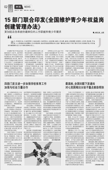 15部門聯(lián)合印發(fā)《全國維護青少年權(quán)益崗創(chuàng)建管理辦法》