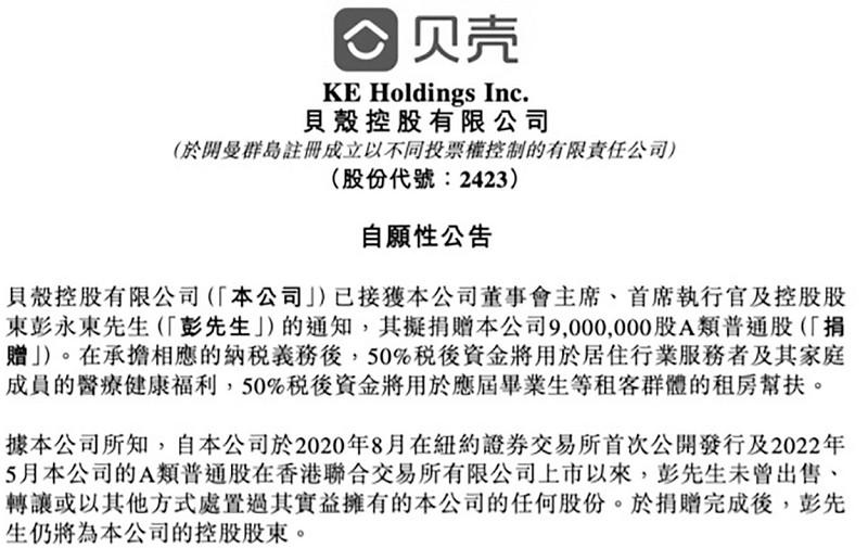 ■ 本報記者 皮磊 4月17日,貝殼發(fā)布自愿性公告稱,已接獲貝殼董事會主席、首席執(zhí)行官及控股股東彭永東的通知,其擬捐贈900萬股A類貝殼普通股。按照17日下午收盤價51.95港元計算,此次捐贈市值約為4.68億港元(約合人民幣4.4億元)。 根據(jù)公告,此次捐贈在承擔相應的納稅義務后,50%的稅后資金將用于居住行業(yè)服務者及其家庭成員的醫(yī)療健康福利,50%的稅后資金將用于應屆畢業(yè)生等租客群體的租房幫扶。據(jù)悉,貝殼為此將設立專門機構,進行長期運營。 據(jù)貝殼方面介紹,當前貝殼平臺聚集了幾十萬名居住行業(yè)服務者,包括房產交易經紀人、家裝安裝工、租賃管家等。通過兜住居住行業(yè)服務者及其家庭成員的醫(yī)療健康風險,讓這些服務者更有尊嚴地提供服務,更安心地工作,將有益于服務者長期執(zhí)業(yè)以及為消費者提供更優(yōu)質的服務。此外,該筆捐贈也將幫助應屆畢業(yè)生等群體“租得起”“住得好”,緩解他們的住房問題。 公開資料顯示,貝殼集團起源于2001年成立的鏈家房地產經紀公司,2009年上線“鏈家在線”,2018年貝殼正式上線。2020年,貝殼在紐交所上市,成為中國居住服務平臺第一股。2022年,貝殼在港交所上市。2023年,其推出“一體三翼”戰(zhàn)略升級,其中“一體”指新房、二手房交易,“三翼”指整裝、租賃和貝好家業(yè)務。 依托平臺優(yōu)勢,近年來貝殼持續(xù)聚焦社區(qū)公益。 自2014年起,鏈家在全國各城市推出“高考休息站”,利用門店的休息空間、便民服務等資源為考生及家長提供便利。此后,隨著更多經紀品牌和門店加入,“高考休息站”升級為“高考服務站”,成為貝殼重點公益項目之一。 此外,自2018年發(fā)起“我來教您用手機”項目以來,貝殼長期關注社區(qū)場景中“一老一小”的需求。日前,貝殼公益先后啟動“穩(wěn)當當計劃”和“銀發(fā)守護計劃”兩個新的助老公益項目。其中,前者主要聚焦老舊小區(qū)的老年人出行安全,為未安裝電梯的老舊小區(qū)加裝樓道內所有樓層的靠墻扶手和樓梯首尾臺階警示標識?!般y發(fā)守護計劃”則聚焦獨居老人的居家安全問題。項目整合貝殼惠居的平臺技術優(yōu)勢,為60歲及以上獨居老人免費提供“智能硬件+平臺服務+意外保險”守護方案,以及跌倒報警器和語音報警器等智能設備,同時搭建高效響應平臺,確保老人需求及時響應。 自2021年起,貝殼面向全平臺各品牌、店東、經紀人和員工發(fā)起“善貝GO”公益行動,鼓勵志愿者通過捐獻步數(shù)兌換愛心資金,捐助公益項目。在助力鄉(xiāng)村振興方面,貝殼“經紀人助農計劃”借助平臺力量,將經紀人家鄉(xiāng)的農產品銷往全國,并通過點對點專項指導、一對一直線幫扶模式,提供產品包裝上架、圖片展示、銷售服務等全流程指導,助推鄉(xiāng)村產業(yè)振興?!爸凵鐓^(qū),在‘小美好’中創(chuàng)造‘大能量’。”彭永東曾對媒體表示,貝殼發(fā)揮全國范圍內的門店及服務者優(yōu)勢,深入眾多社區(qū),成為公益“毛細血管”,在創(chuàng)造社會價值的同時,為品牌價值觀的展現(xiàn)、口碑的建立、公益IP的培養(yǎng)形成助力。 |