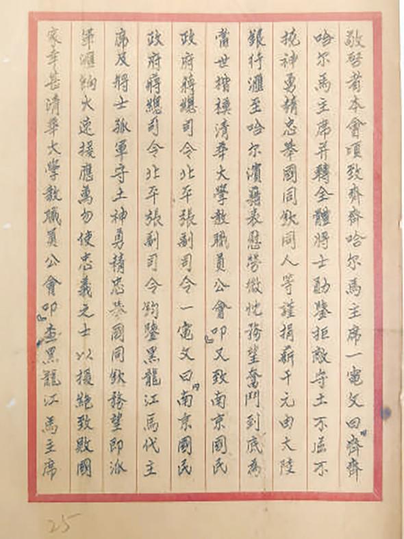 1931年,日本悍然發(fā)動九一八事變,中國人民不屈不撓的局部抗戰(zhàn),揭開了世界反法西斯戰(zhàn)爭的序幕。作為中國武裝抗日的“第一槍”,江橋抗戰(zhàn)宛如一聲驚雷,在白山黑水間激民族之義憤,燃滿腔之熱血。北平各界同仇敵愾,通過聲援、募捐等方式,表達對抗日志士的支持和守土衛(wèi)國的決心。 臨危受命江橋迎戰(zhàn)關東軍 初夏的清華園,萬物蔥蘢、水木禽鳴,荷塘漣漪一圈圈蕩開。禮堂前,“行勝于言”的石刻在陽光下熠熠生輝。 正值周末,入校游學的青少年絡繹不絕,在標志美景前競相留影。風華正茂的學子騎著車經過,衣角飄動,聚焦了人們欽羨的目光。 近百年前,以清華為代表的北平高校師生,同樣以實際行動,成為全民抗戰(zhàn)意識的引領者,正是“行勝于言”的無聲寫照。 1931年,九一八事變爆發(fā)后,日本侵略軍一周內相繼侵占遼、吉兩省主要城市,并圖謀進犯黑龍江省。黑河警備司令兼步兵第3旅旅長馬占山臨危受命,主持黑龍江軍政。 “馬占山在嫩江北岸至昂昂溪之間,構筑了三道防線。11月3日,日軍兩列鐵甲車開赴嫩江橋,日軍飛機向中國軍隊投擲炸彈?!北本┦袡n案館展陳處副處長劉靜的講述,令人感受到當時戰(zhàn)況之激烈。“東北氣溫已低至嚴寒,馬占山率領愛國官兵,以落后的武器、簡陋的裝備,迎戰(zhàn)擁有飛機、大炮、坦克的日本關東軍,喊殺聲、刺刀撞擊聲震蕩山野……半個月的時間,抵擋了日軍一波接一波的攻擊?!?br> “男兒抗日死沙場,青史垂名姓字香?!苯瓨蚩箲?zhàn)的消息傳到北平后,愛國學子熱血沸騰,紛紛請纓要求北上抗日。與此同時,北平各界慷慨解囊,為抗日將士募集善款。其中清華大學發(fā)揮了先鋒作用,該校教職員公會對日委員會捐薪千元,緊接著,由學生自治會迅速組織全校募捐活動。 慷慨解囊為將士募集善款 不僅自發(fā)籌措善款,清華大學教職員公會對日委員會還發(fā)函致北平大學工學院,邀對方對馬占山進行一致聲援。 很快,北平大學工學院也發(fā)出募捐慰勞馬占山及諸將士的啟事。劉靜展開這份1931年11月27日的史料,其上載明“當此雪地冰天,前方愛國將士斷頭折臂,努力為國家爭存亡之際,吾輩身在后方,未能先期赴國難,自當各盡職責,以表救國之意……”字里行間,盡顯高校青年的報國情懷。 學界之外,各界群眾也自發(fā)組織慰問團、后援會,捐款捐物,全力支持。劉靜介紹,例如東北民眾救國會,爭取張學良以及國內各界人士、海外僑胞的資助,開展募捐和“義賣”,發(fā)行“愛國獎券”等,給黑龍江軍民以極大的支持。 一封封書信、電報,記錄下這段波瀾壯闊的歷史。1932年1月4日的《國立清華大學??飞希禽d馬占山將軍給清華大學的復電,稱:“承惠巨款,益勵初衷。謹率部曲遙致謝忱?!倍盏狡浇驅W術團體對日聯合會發(fā)來的電報后,馬占山更回復,“占山忝屬軍人,尤其責無旁貸,茍一息之尚存,豈慮孤軍之苦戰(zhàn)。”鏗鏘有力的表達,書就這位民族英雄的氣節(jié)風骨,也掀開軍民同仇敵愾,保家衛(wèi)國的篇章。 奔走宣傳直面“最殘酷時代” 江橋抗戰(zhàn)的壯舉震動海內外,除捐款捐物,北平各界還廣泛發(fā)起宣傳活動。其中北平師范大學(現北京師范大學前身)師生表現活躍,組織了國立北平師范大學教職員對日外交后援會(后改稱平津學術團體對日聯合會師大分會)、北平師范大學抗日救國會等團體,分析抗戰(zhàn)形勢,揭露日本暴行。 如今的北京師范大學,地處車水馬龍的北三環(huán)旁,徜徉校園,傍晚的風攜來芬芳花香,耳畔蕩起廣播悠揚的樂曲。正是拍攝畢業(yè)照的時節(jié),意氣風發(fā)的年輕人三三兩兩,在古色古香的教學樓、京師學堂、校訓石碑前,定格下青春的光影。 當年,也是這樣年紀相仿的學子們,心懷大義,為民族存亡奔走呼號。據北師大校史研究室提供的資料,1931年10月26日,該校學生抗日救國會宣傳隊,曾赴長辛店機車廠演講抗日救國,并散發(fā)《為日本帝國主義占領東三省告工友書》。 此外,北平師范大學抗日救國會還創(chuàng)辦了《抗日周刊》,北京市檔案館所藏第二期,出版于1931年11月2日。末尾征稿啟事疾呼:人類最殘酷的時代已經降臨到我們面前了!這種“殘酷”“無理性”“暴戾”,逼迫著我們不得不負起這種重大的使命去奮斗,去拼命,去推倒一切的人壓迫人的禽獸行為!并號召同學們努力投稿,“戰(zhàn)勝一切的障礙,充實抗日的內容?!?br> 劉靜介紹,北平各界的全力支持,給了馬占山將軍抗戰(zhàn)到底的動力?!敖瓨蚩箲?zhàn)更喚起中華民族的空前覺醒,作為中國人民抗日斗爭的序曲,永載史冊?!?br> ?。〒侗本┩韴蟆罚?!--/enpcontent--> |